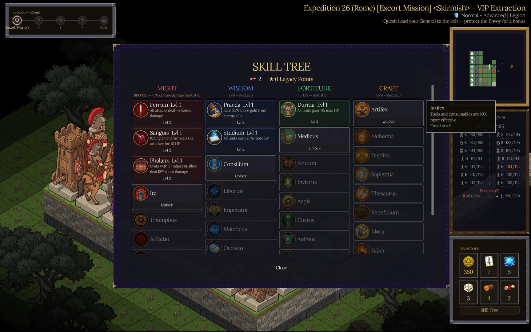 Fog of war hides what's ahead. Lava, quicksand, crumbling tiles, and acid pools punish careless positioning. Spend gold at shops, gamble with card dealers, spin the Wheel of Fortune, visit the Oracle for blessings, or sacrifice at the Altar of Mars for War Scrolls. A 36-skill tree with 4 branches lets you shape your playstyle across runs.