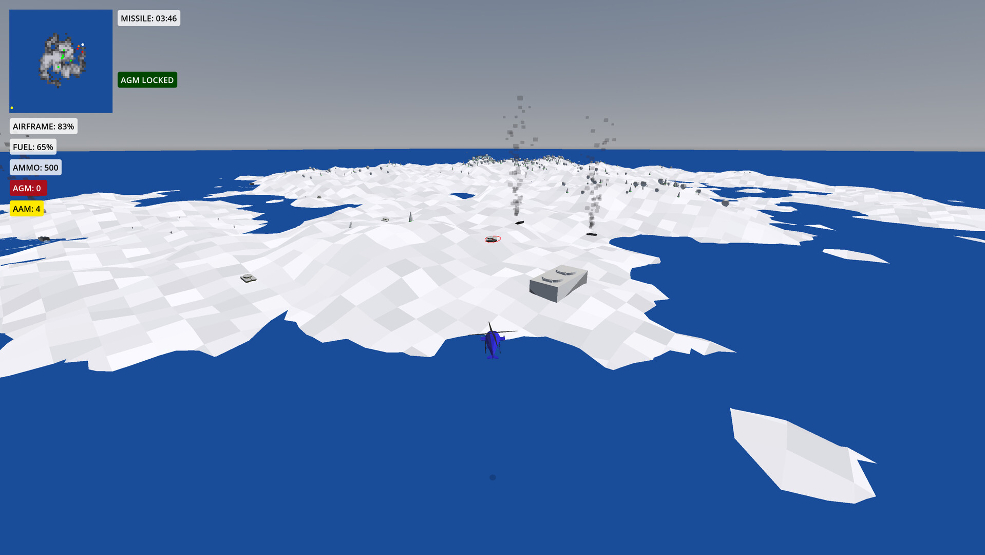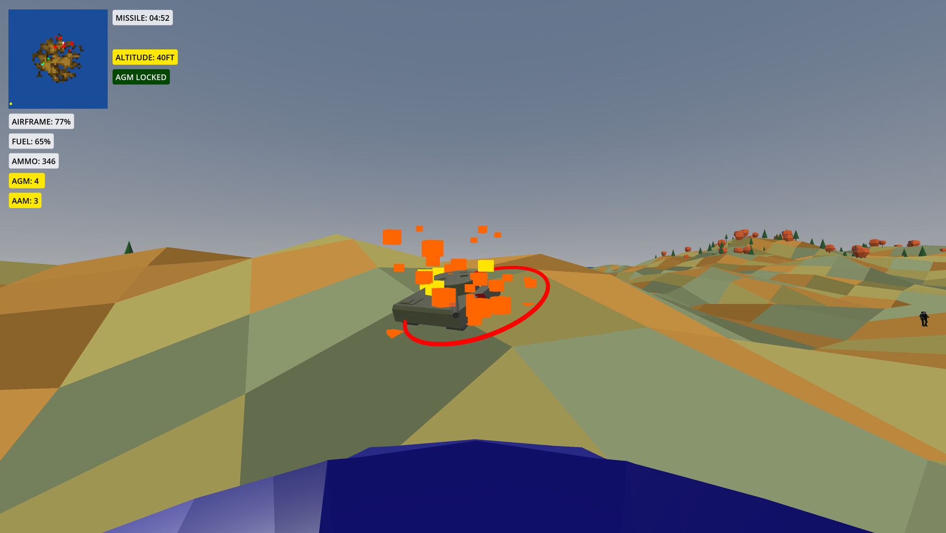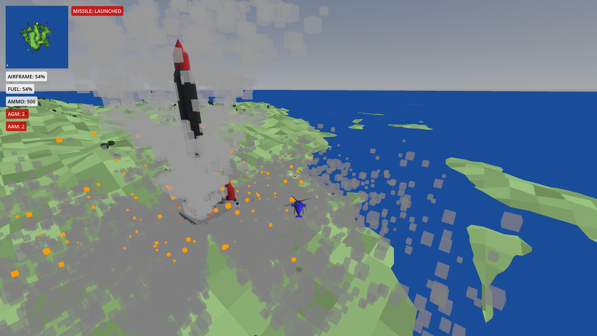 Each mission drops you over a procedurally generated island - no two maps are the same. Your objectives are straightforward, but execution is anything but. Destroy enemy tanks, neutralize ground forces and locate friendly soldiers stranded behind enemy lines. Get low, drop a rescue line, and bring them home. All while watching your fuel gauge, managing your ammunition, and keeping one eye on the missile launch countdown timer. When that missile launches, the mission is over.