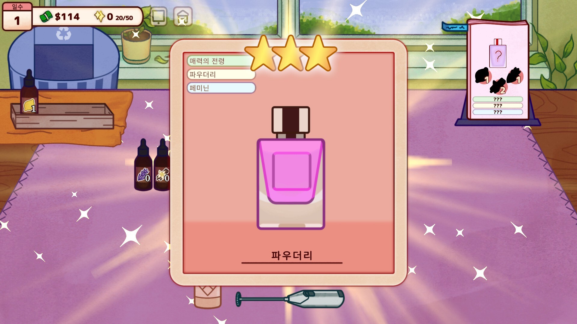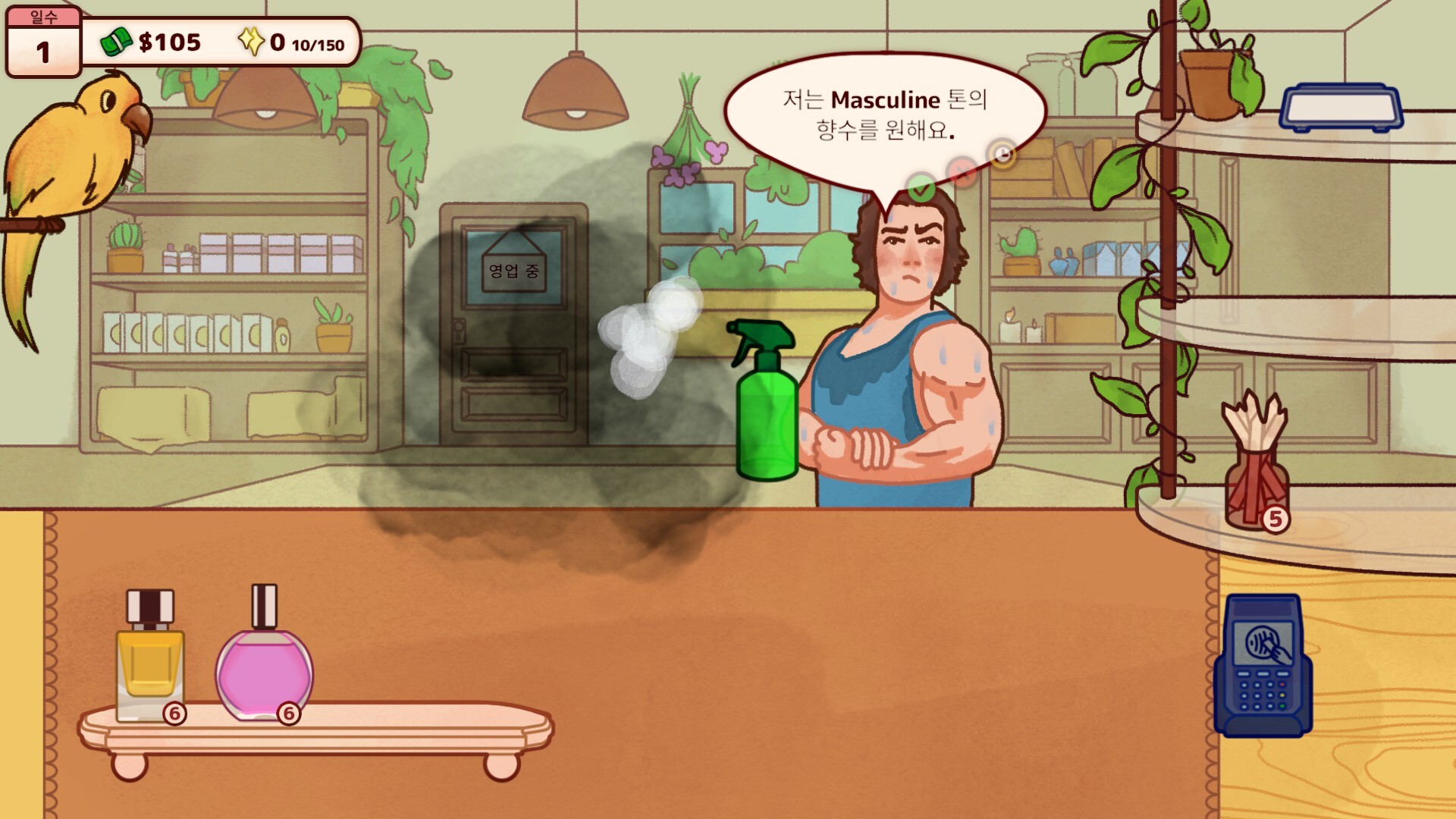 사랑하는 조향사님, 당신의 작은 가게에 돌아오신 것을 환영합니다. 모든 번잡함을 문 밖에 두고, 마음을 가라앉혀 앵무새 친구와 함께 이 향수 아틀리에을 가꿔보세요! 여기서는 각기 다른 성격의 손님들을 만나고, 그들에게 가장 잘 어울리는 향수를 골라주어 모든 손님이 만족하며 돌아가게 하세요.