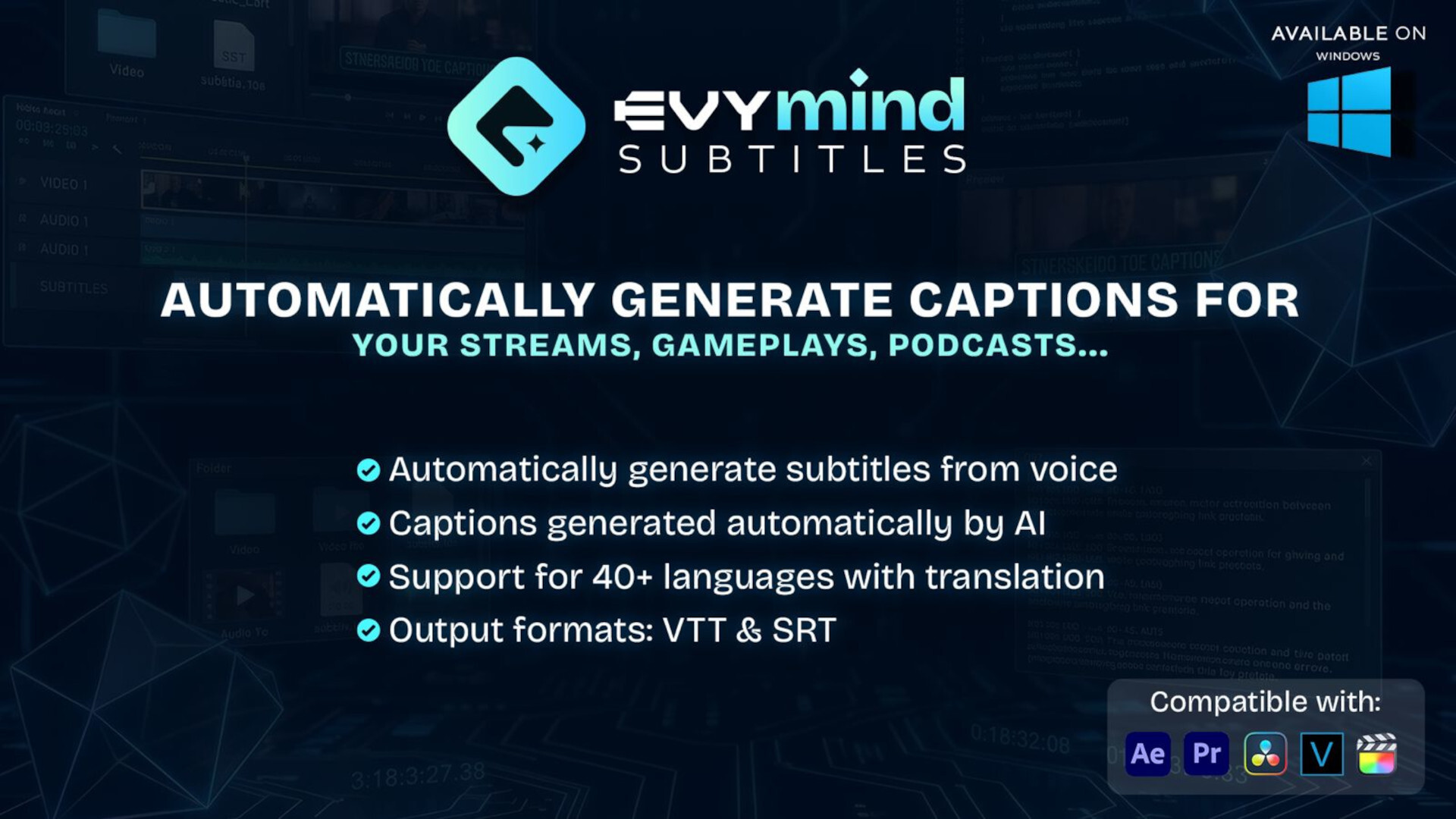 Evymind Subtitles는 영상/오디오 콘텐츠용 자막 파일을 생성, 편집, 번역, 내보내기까지 할 수 있는 데스크톱 자막 도구입니다.