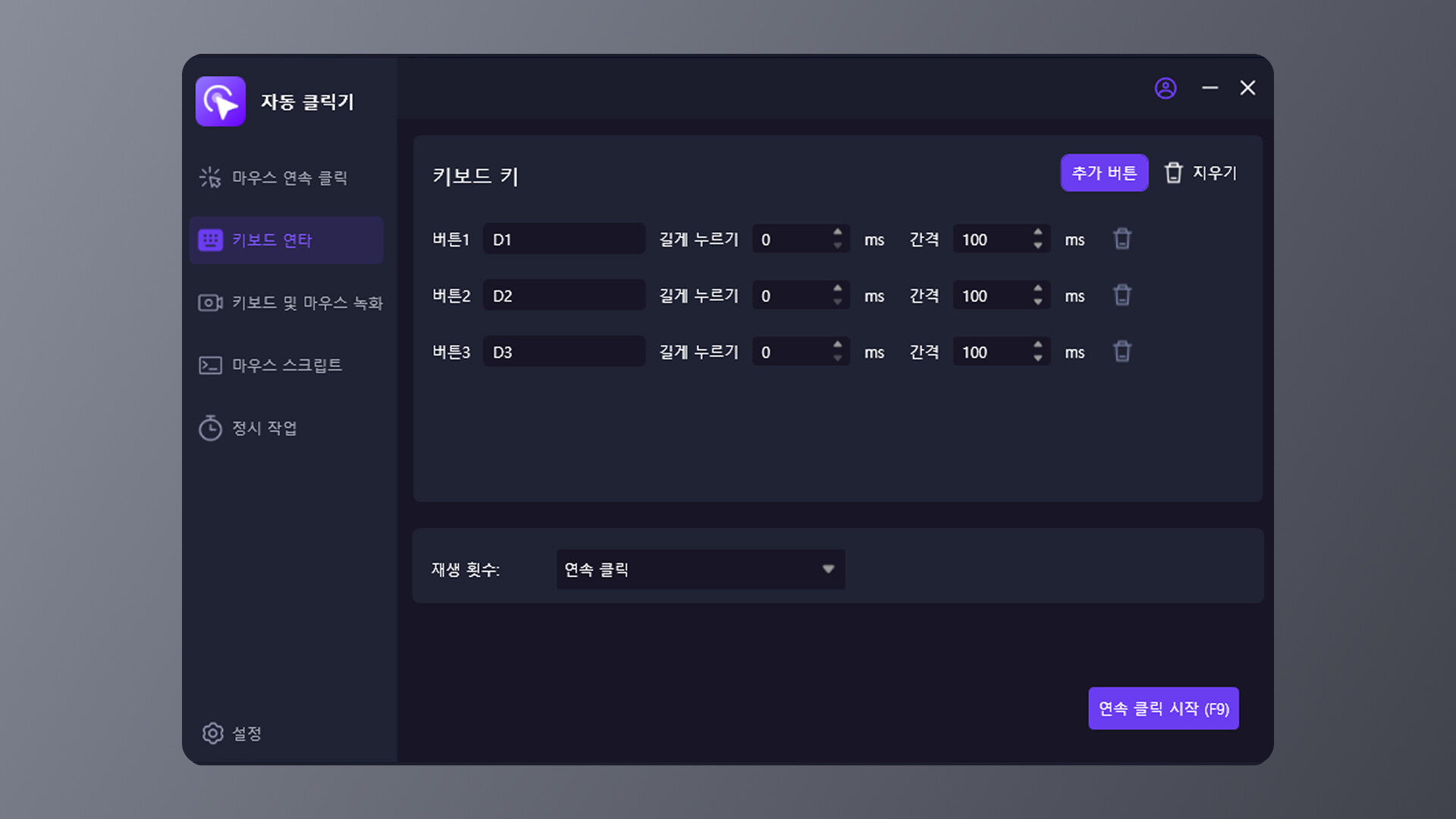 클릭 간격과 속도 조절 가능, 고속 연속 클릭 지원