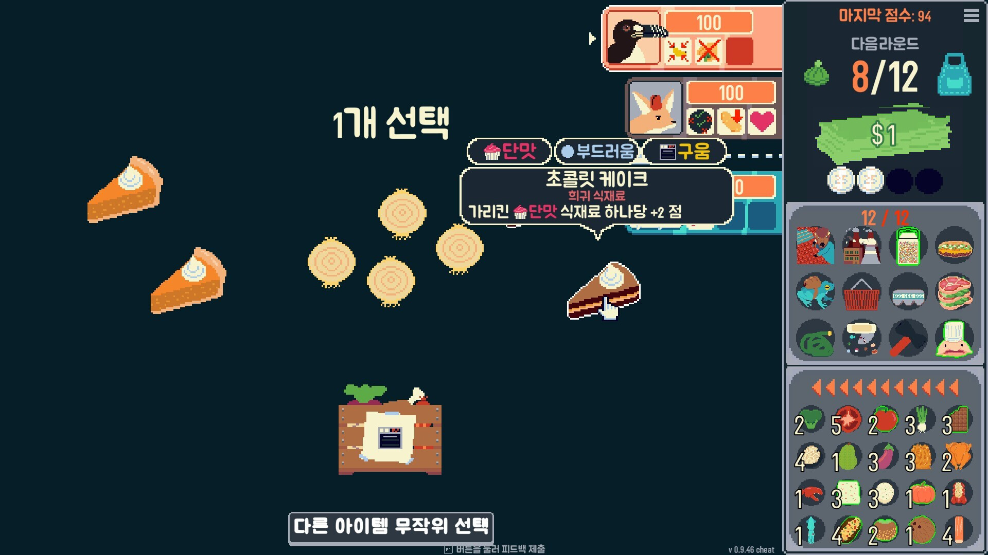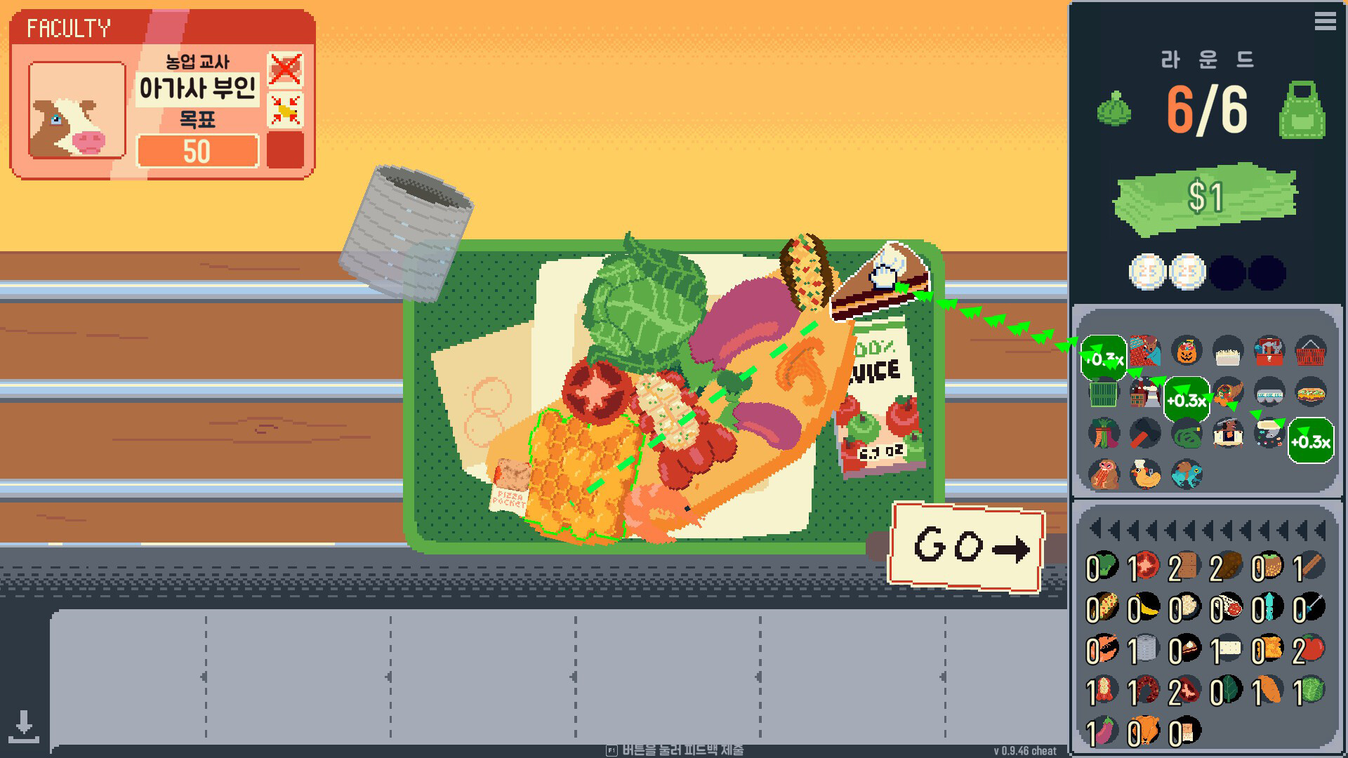 재료를 직접 오믈렛 위에 배치하라. 재료들은 서로 영향을 준다: 고추는 모든 걸 불태우고, 치즈는 배수를 중첩하며, 같은 카테고리는 콤보를 발동한다. 배치 위치가 점수를 좌우하며—한번 올린 재료는 다시 집을 수 없다.