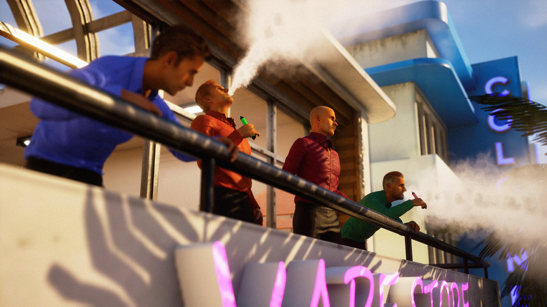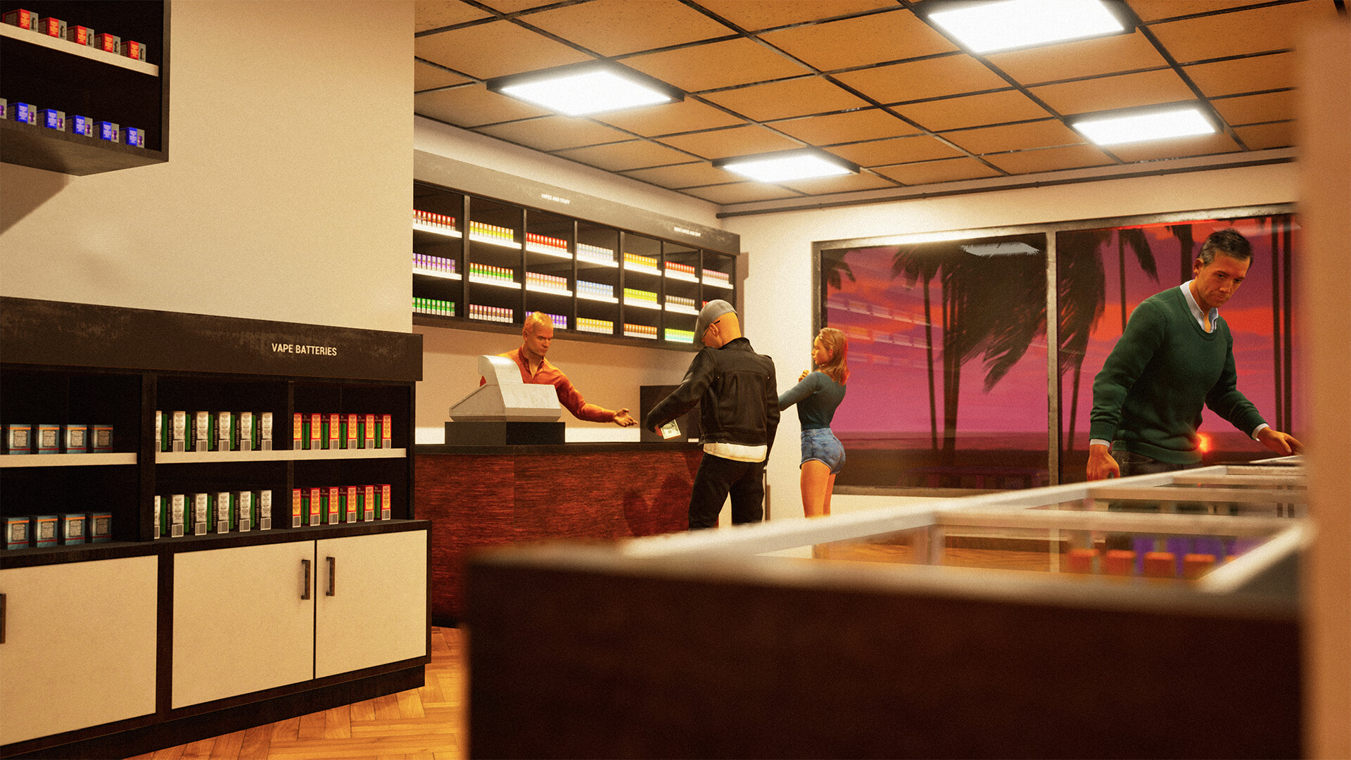 Take in an 80s-inspired Miami with blazing sun, palm trees moving in the wind, and dynamic weather that gives the city more life. Customers have their own look and character, so the world doesn’t feel dead or repetitive.
