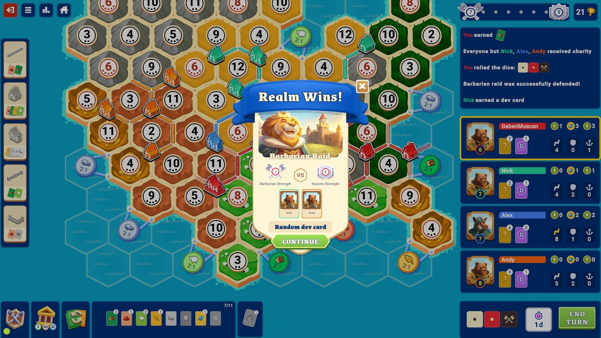 Military: Build up your military to defend against barbarian attacks and use your military to raid your opponents (Just like the Robber!)