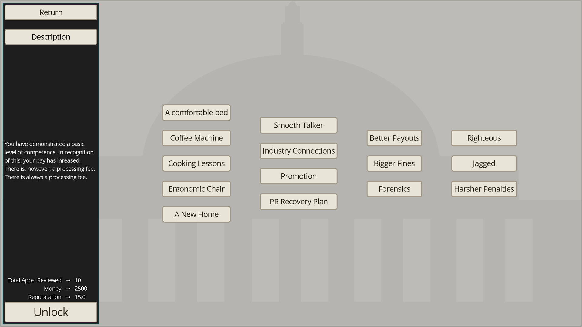 Your performance is tracked. Get enough right and you'll have access to an upgrade tree that improves how you work - better tools, expanded regulatory knowledge, and other institutional advantages described, in the upgrade menu, with sincerity. Day by day, your inspector becomes more capable. Whether that's a good thing is between you and the upgrade screen.
