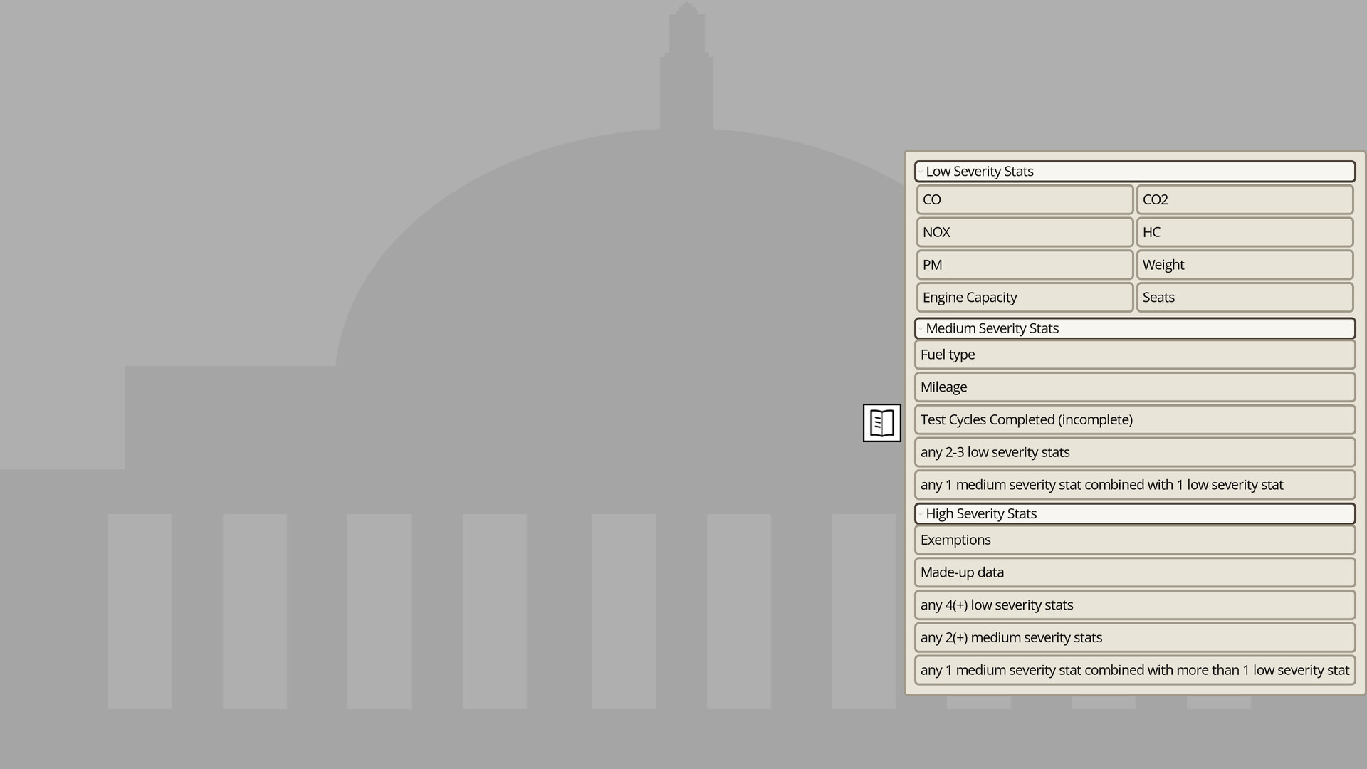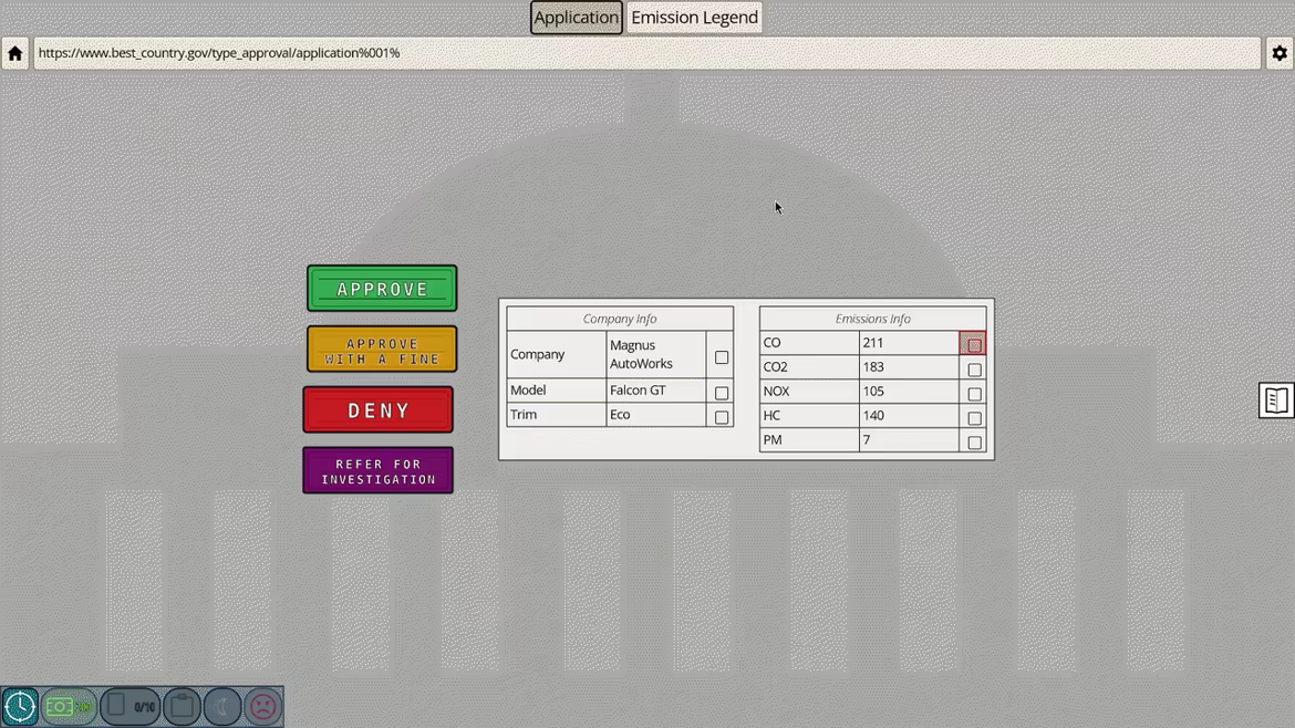 Each day, a stack of vehicle registrations lands on your desk. Your job is to review them against current regulatory standards - checking for faults, flagging discrepancies, deciding whether each vehicle gets approved, fined, investigated, or denied outright. Miss a fault and you've let something dangerous onto the road. Flag something incorrectly and you've wasted everyone's time, including yours. As time passes, the guidelines grow stricter and new regulations come into force. You'll need to keep up.