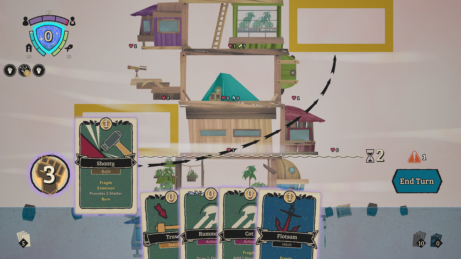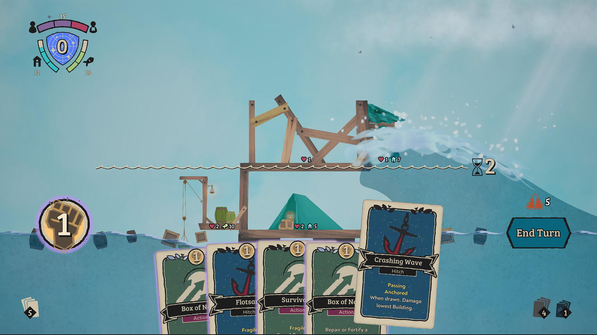 Weather the Tide is a roguelike deckbuilding survival game where time is against you in a flooding world. Only by exploring the wrecks and ruins of what came before, using every scrap available, and charting a new path with the stars, can you hope to rise above the unforgiving seas that threaten to swallow you, your people, and your ramshackle tower.