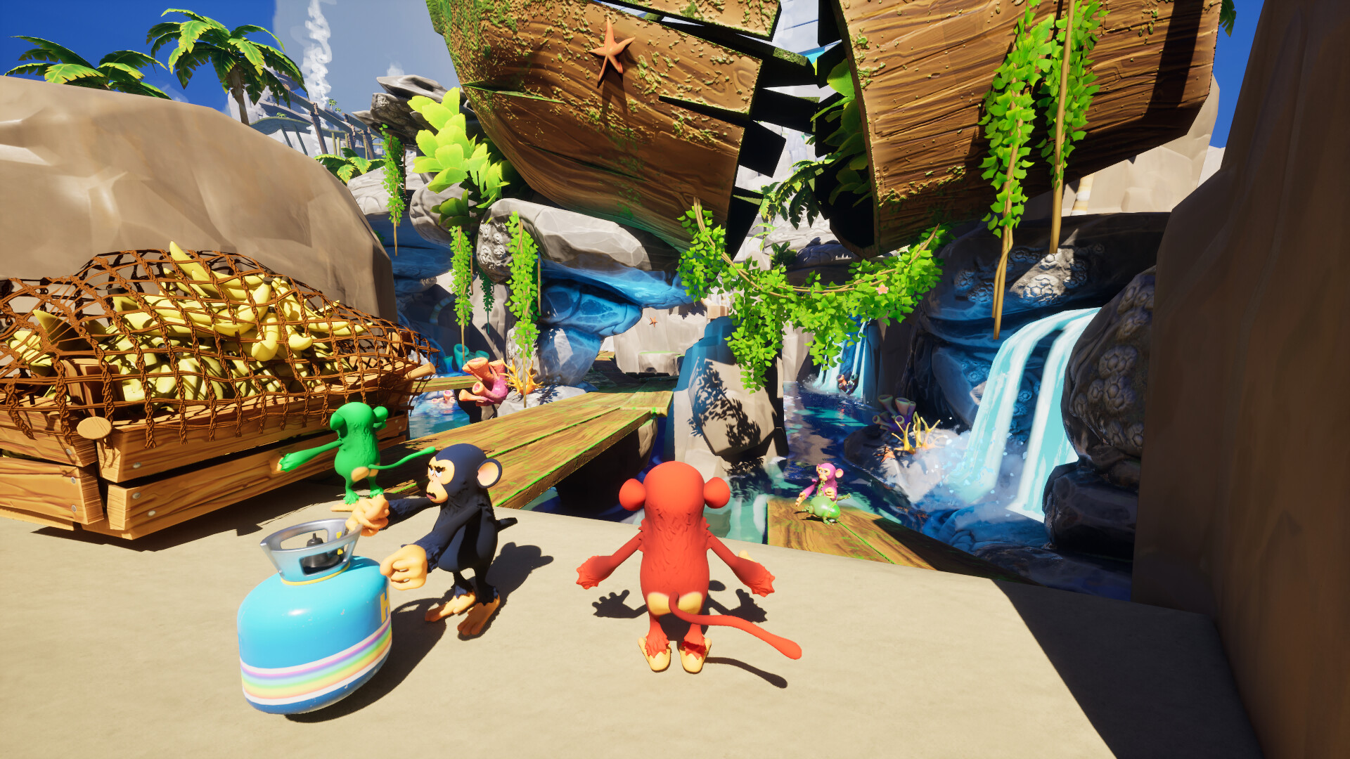 Monkey Bizniz is a co-op game where you collect and extract bananas on a banana cart, as you or a group of monkeys traverse through various hazardous obstacles, and make your way to the top of the summit, in the ultimate banana-hauling adventure!