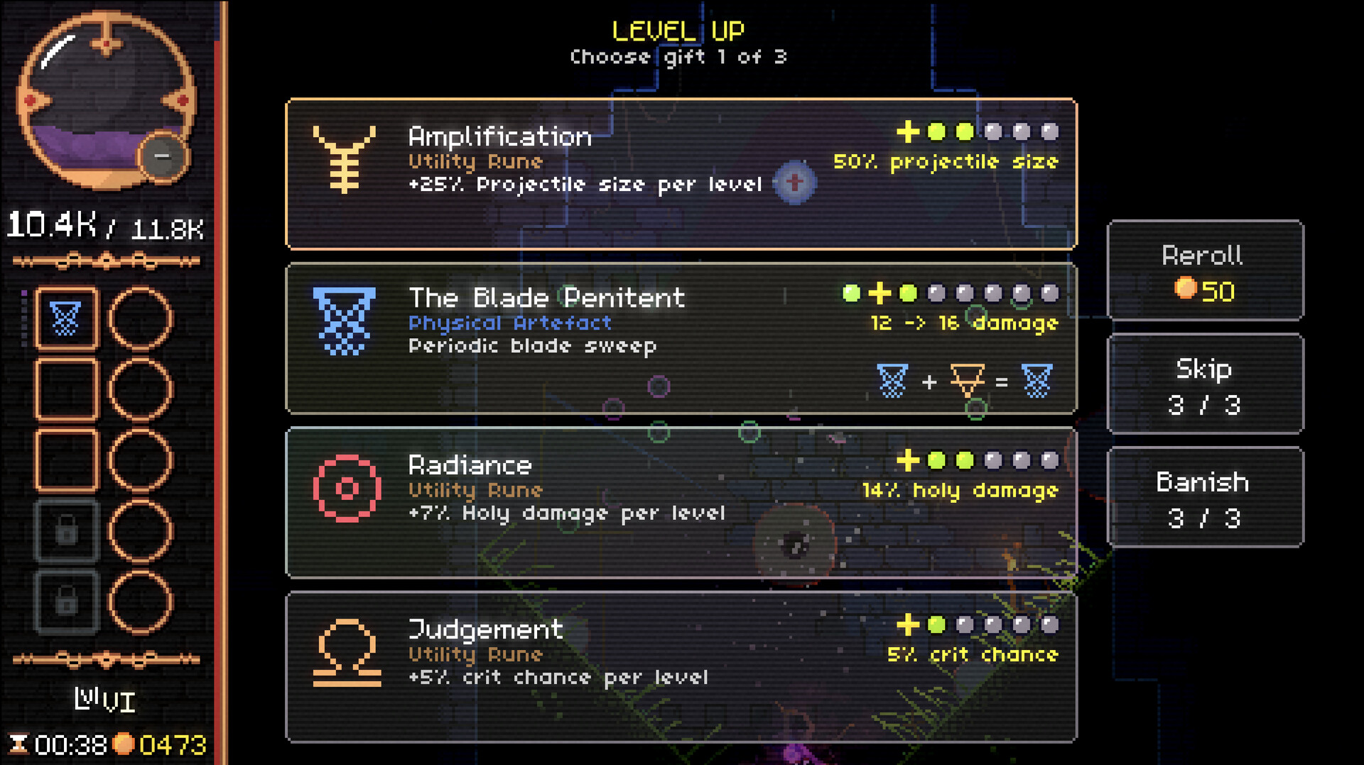 The forgotten god's artefacts have been repurposed in devotion to the Abyss. The Blade Penitent cleaves crystals and horrors alike. Seraphim's Aura sears everything that draws near. The Sentinel thinks for itself, firing holy energy at anything that comes close.