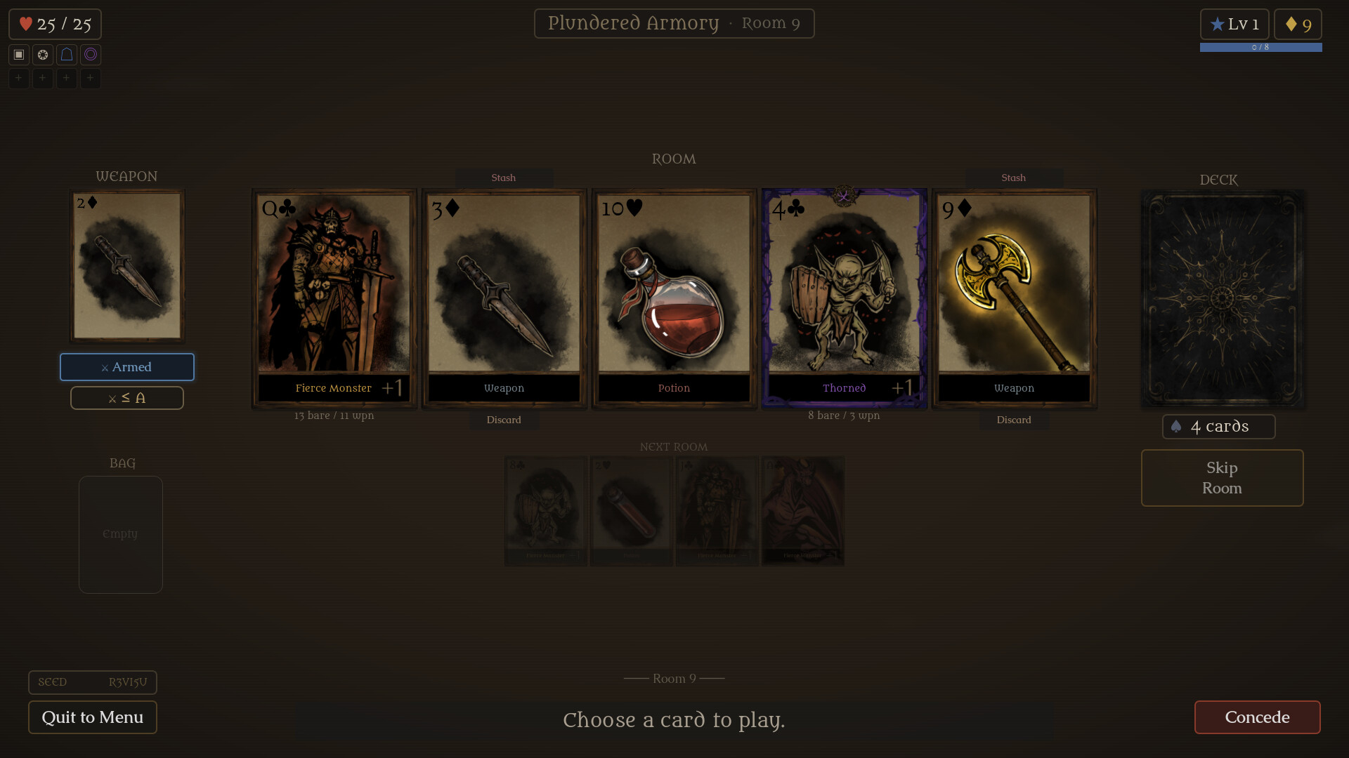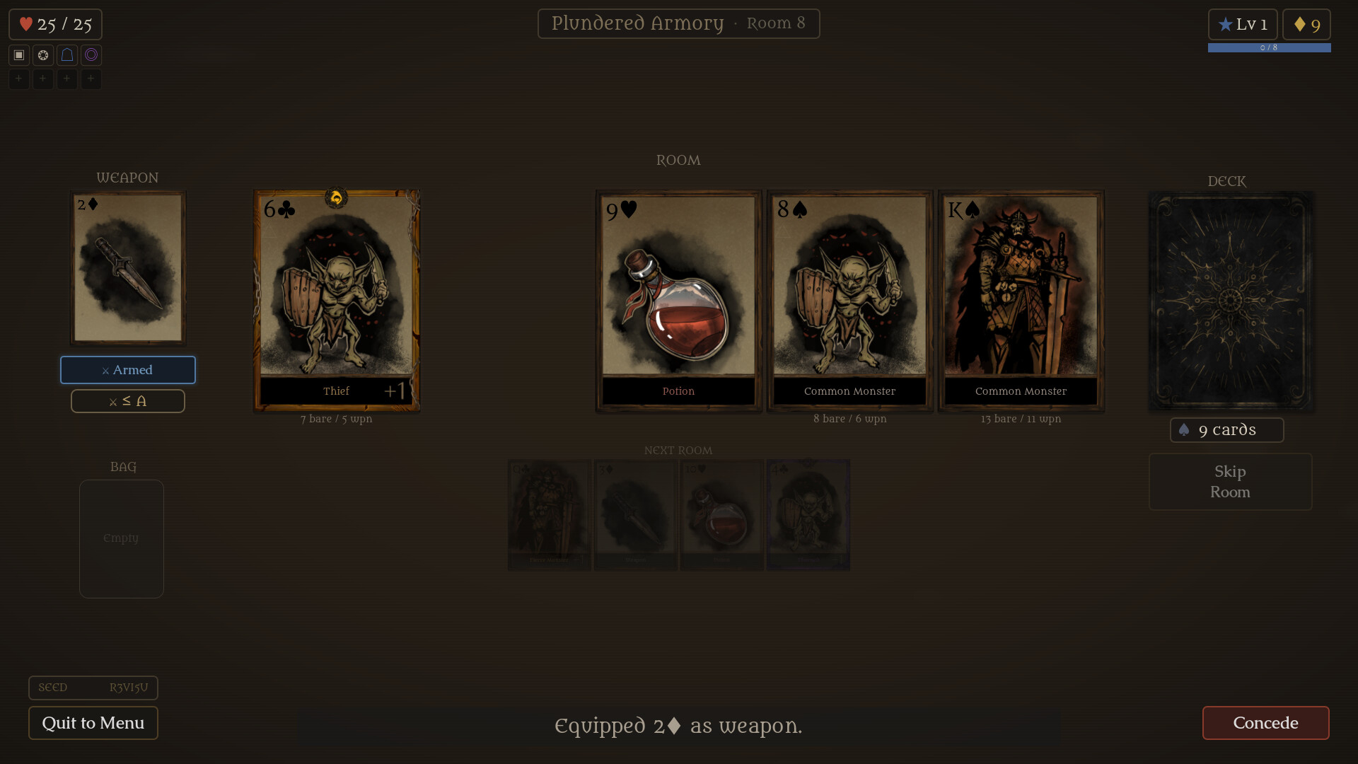 Your weapon follows the descending rule - each kill must be weaker than the last. Swing too early and your blade becomes useless. Go bare-handed and you'll pay in blood. Every card you touch is a decision between survival now and options later.