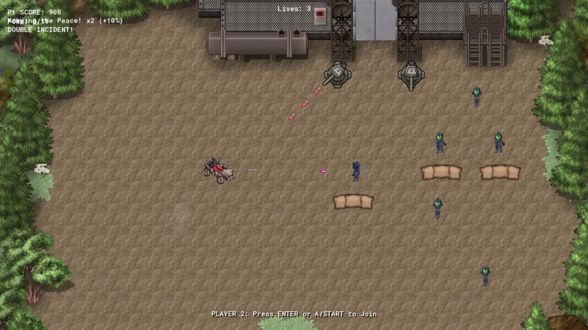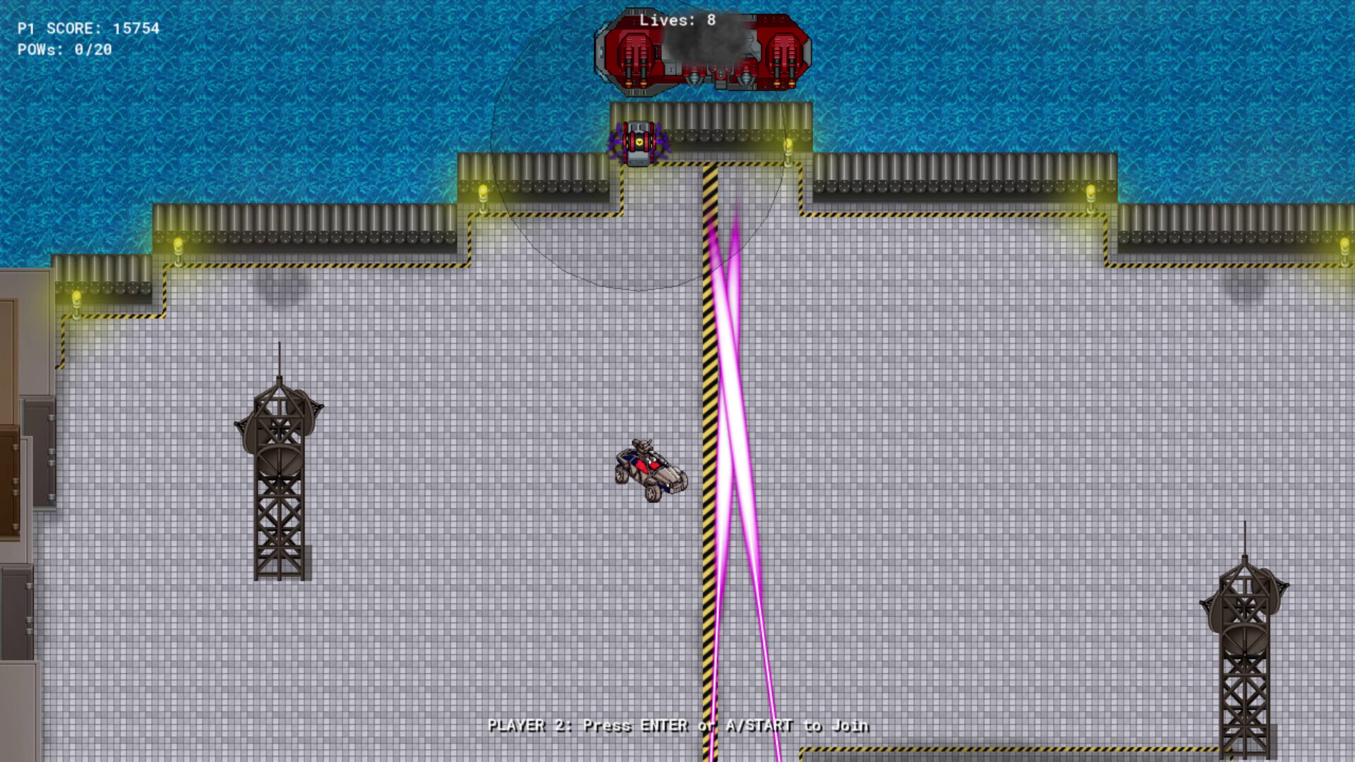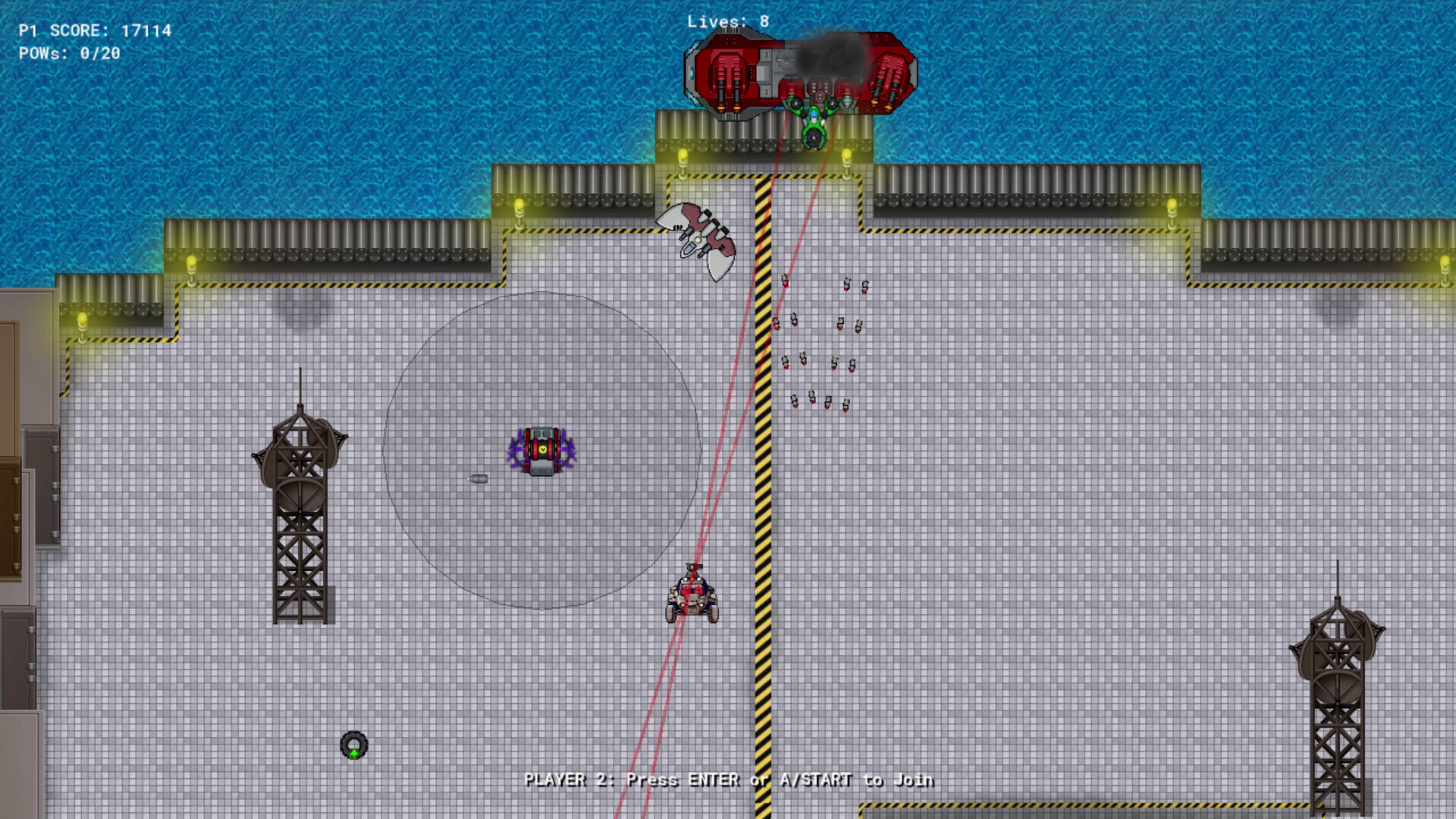 Xtreme Peacekeeper Force is a retro-inspired top-down arcade shooter packed with fast action, explosive firepower, and nonstop combat. Inspired by classic military action games, it puts you in control of an all-terrain combat vehicle as you blast through enemy forces, dodge incoming fire, rescue POWs, and take on challenging boss encounters across dangerous enemy strongholds.