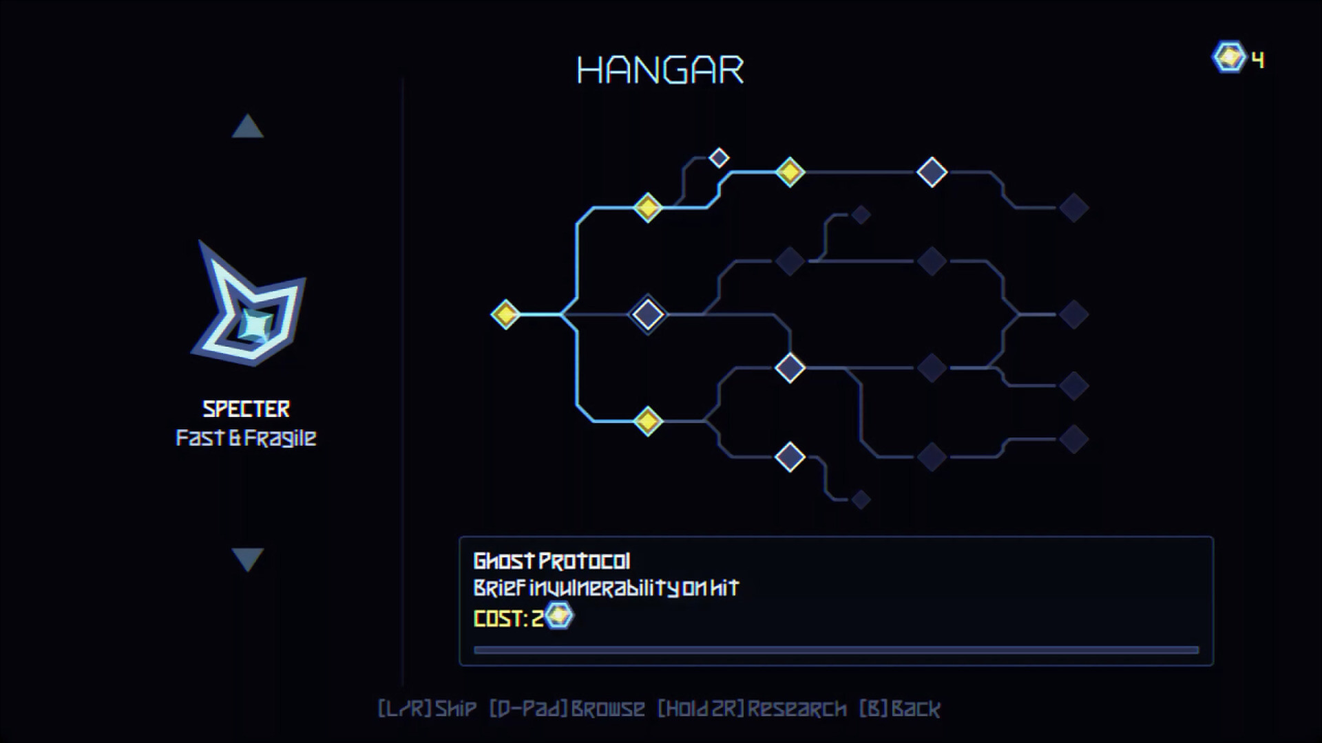 Research trees - spend boss cores on permanent ship upgrades between runs. Unlock new starting loadouts and ship abilities