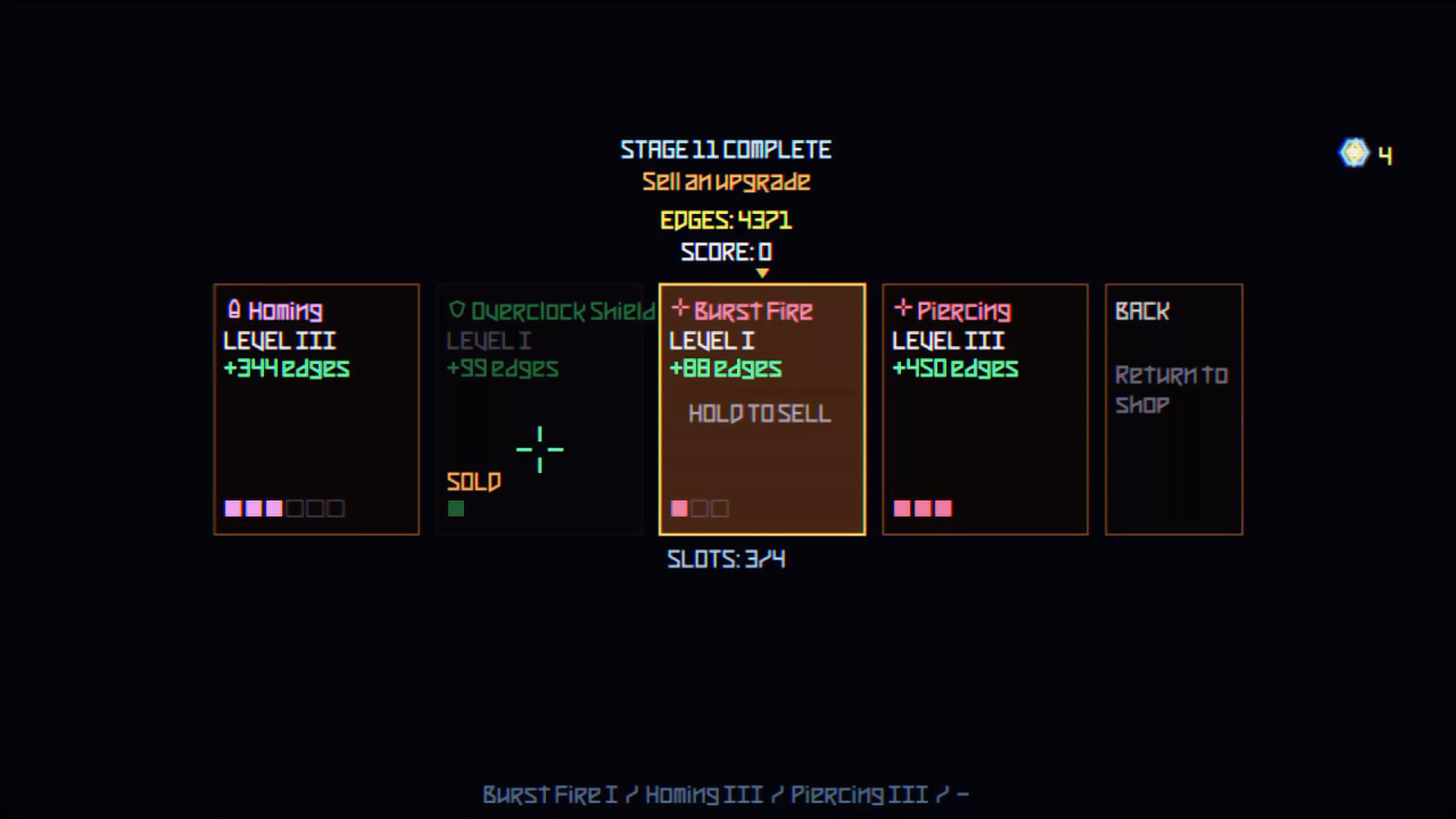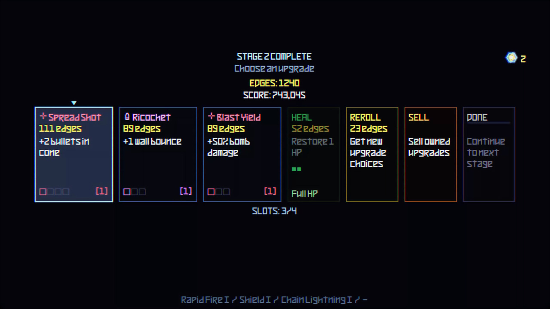 Per-run upgrades - spread shots, homing rounds, ricochets, helical spread, shields, and more. Build devastating synergies in the between-stage shop