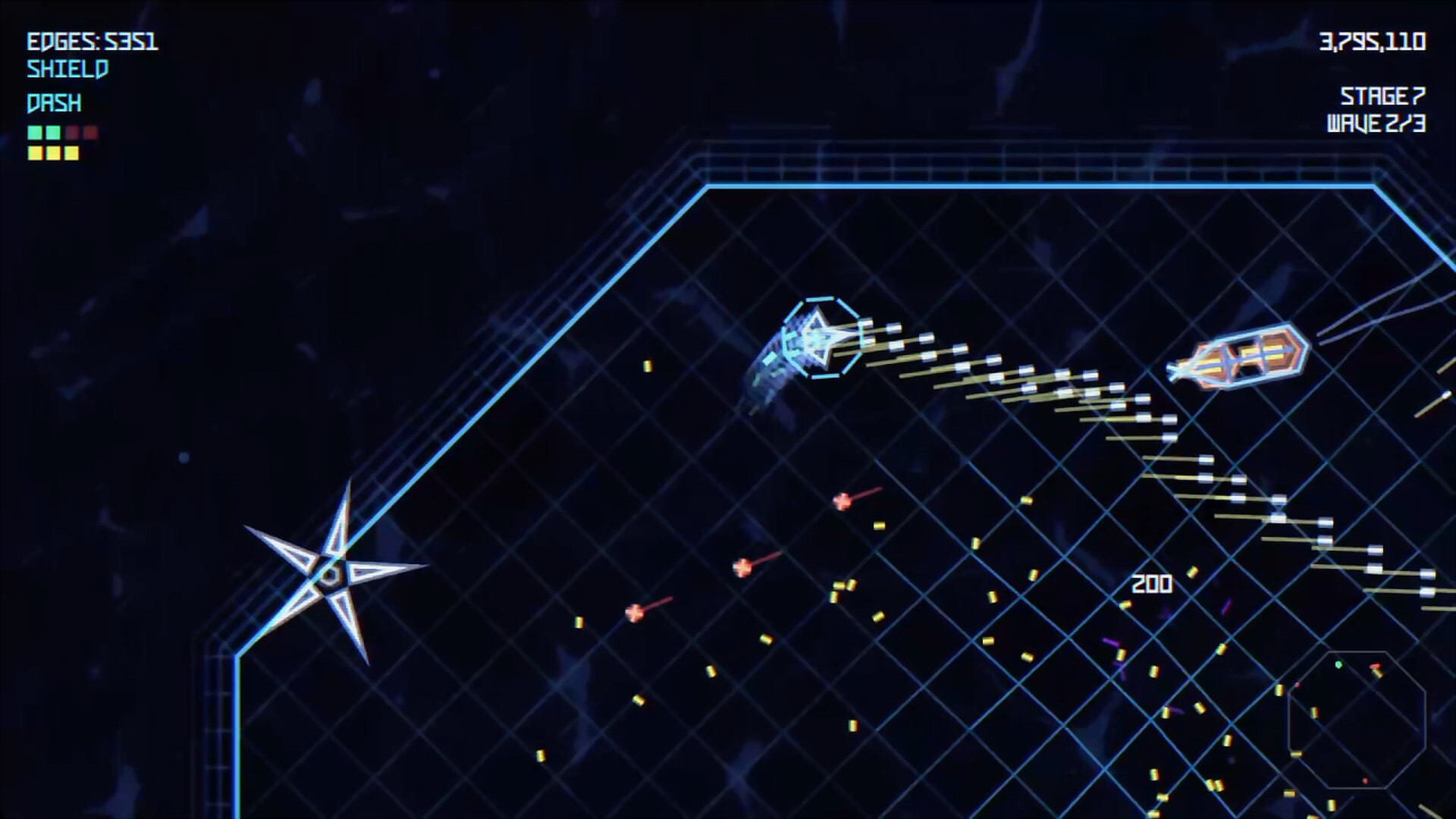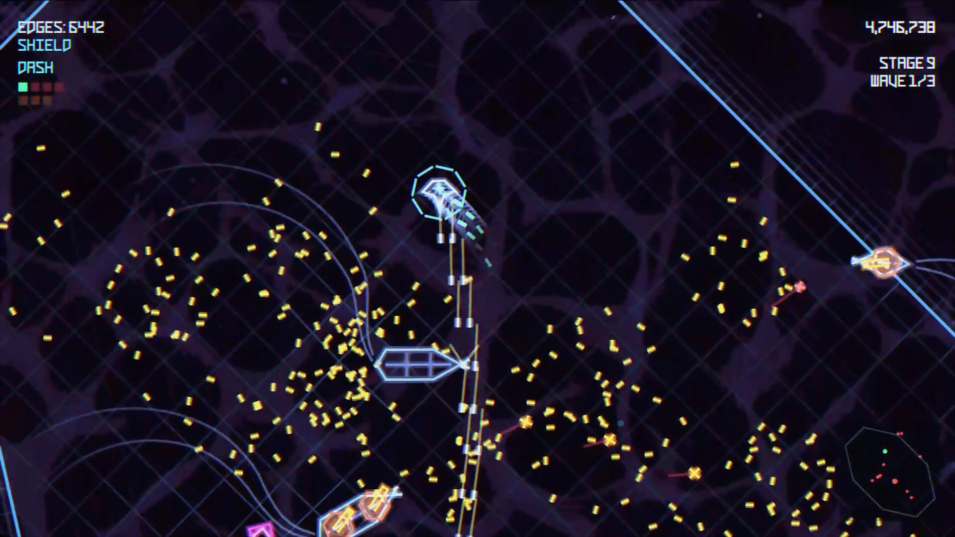 Crisp vector art - every ship, enemy, bullet, and explosion rendered in clean glowing lines on a reactive grid