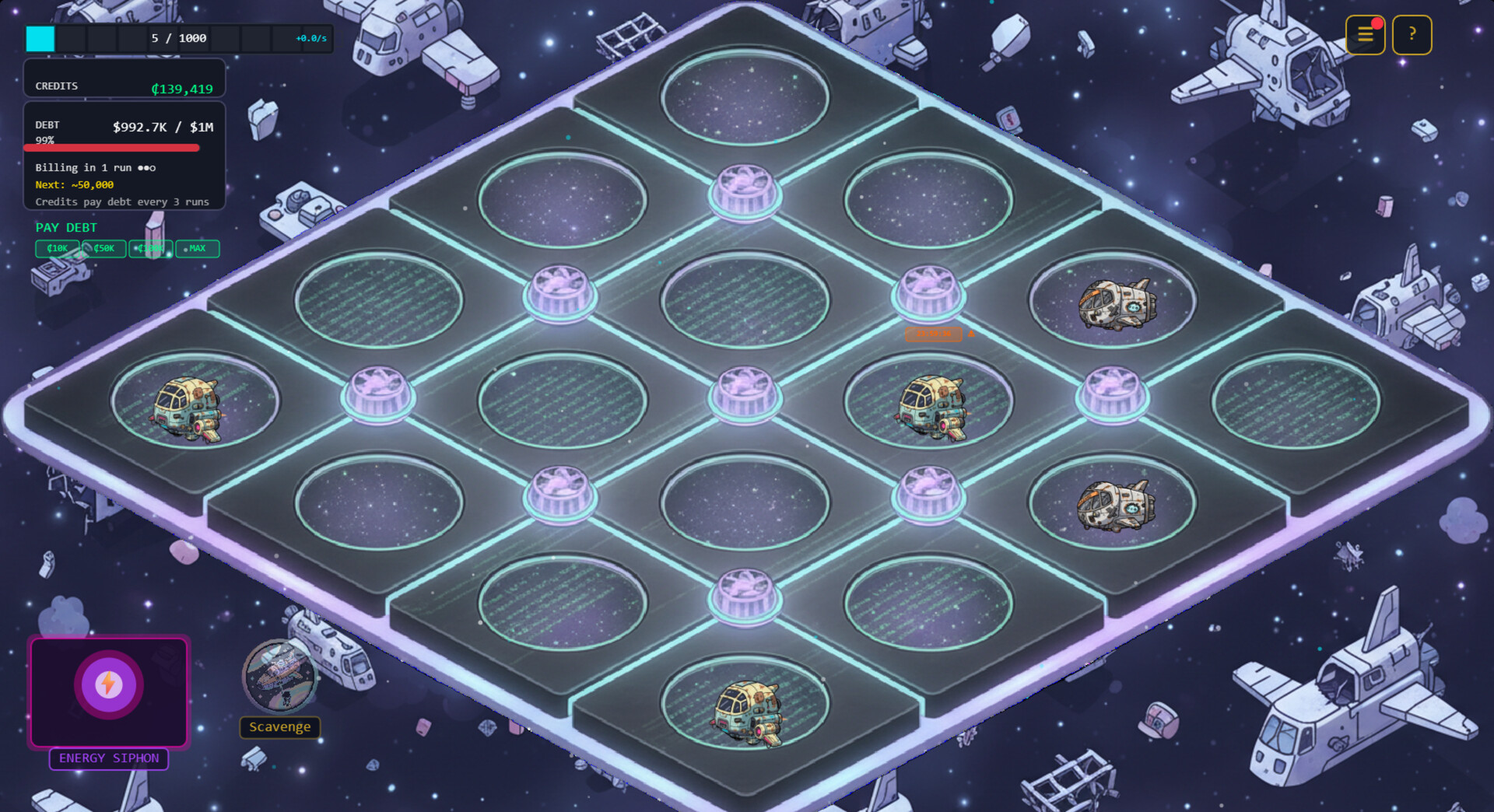 Between runs, you generate the energy you need to survive salvage, and eventually you'll build stations that generate energy and credits. During runs, you draft cards—Scavenge, Repair, Extract—and hope the hull holds. Death isn't the end. Death is how you get stronger.