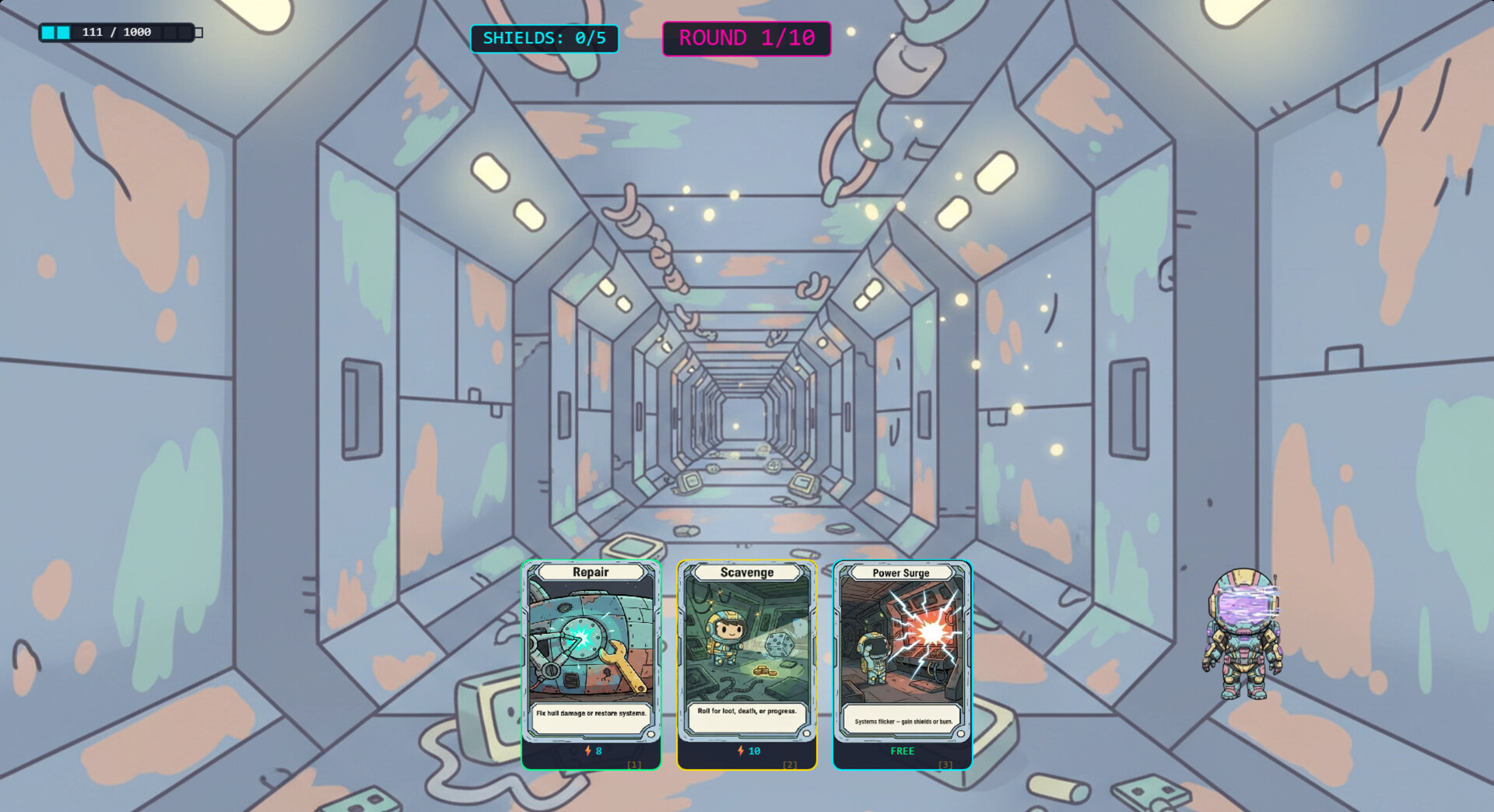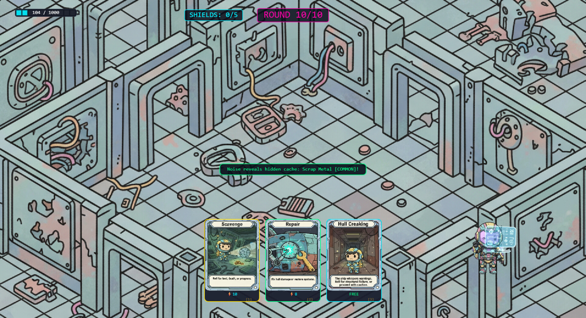 Deck-building roguelike — Draft, Scavenge, Repair, Extract, Shield, Upgrade, and danger cards each round. Energy management. Hull pressure. 10 rounds per run.