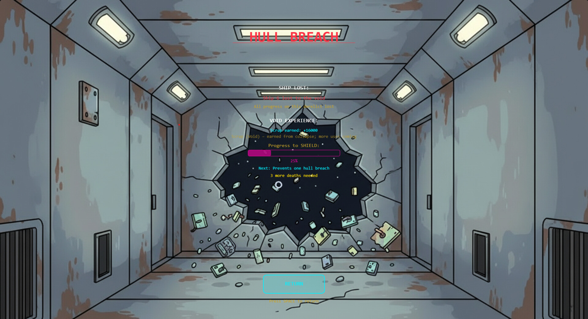 A breach means your run is over. Your salvage? Gone. But every collapse fills a Void Experience bar. At 100%, you tier up: unlock Shield and Upgrade cards, start runs with +1 shield, bank credits, or save crew on death. Dying teaches you. The more you die, the more options you get.