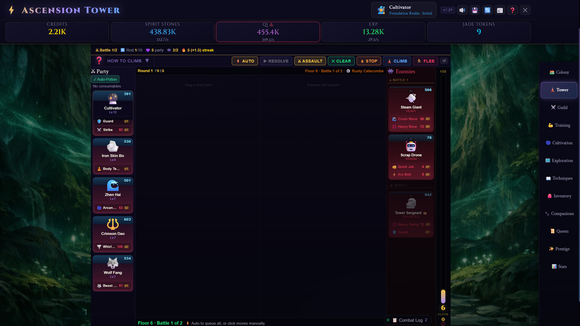 Manual and automated combat across 100 floors. Each floor band has its own biome and enemy types — stone corridors give way to occupied levels by Floor 50, where the enemies are no longer just beasts. Cultivation realms, breakthrough moments, stat allocation, card-based combat moves, and class evolution at the upper floors shape how you fight. Hire help, your going to need it.