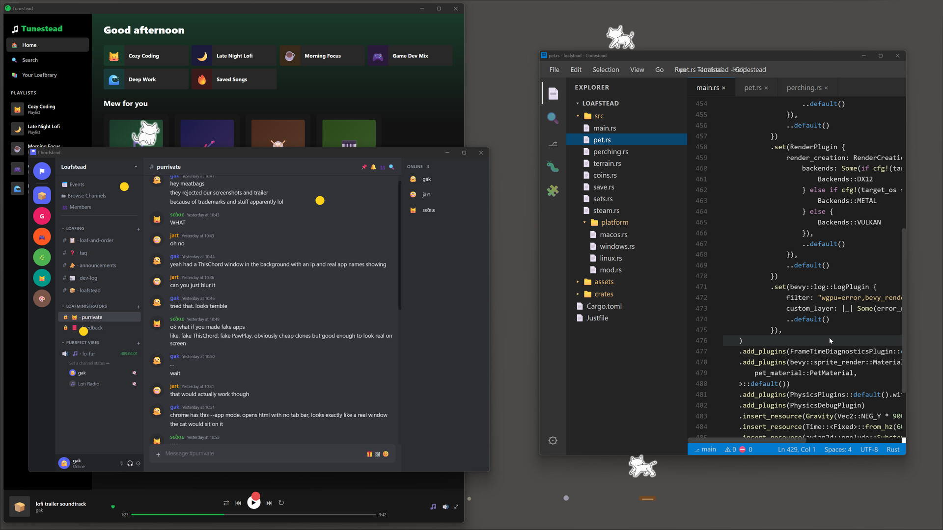 Cats that walk, sit, and loaf on your actual open desktop windows. Browser, code editor, spreadsheet.