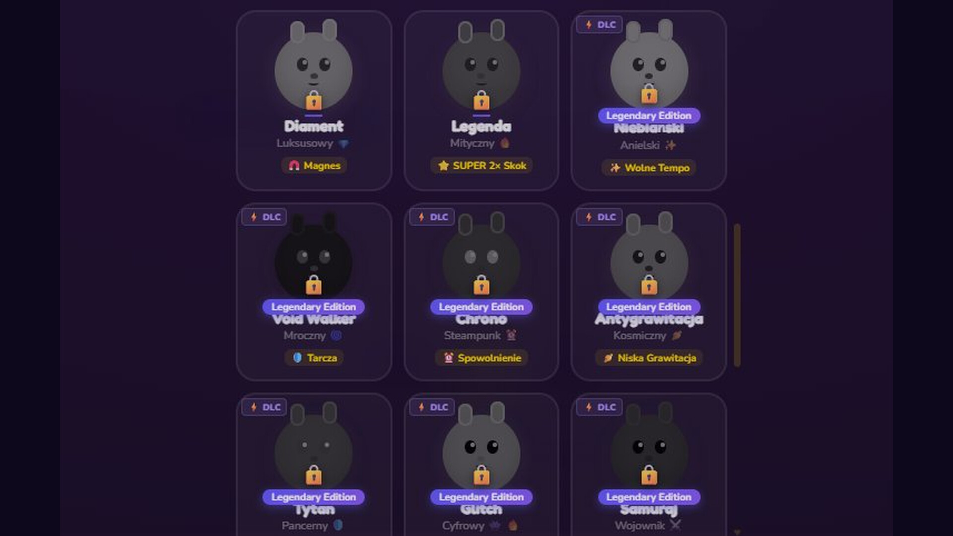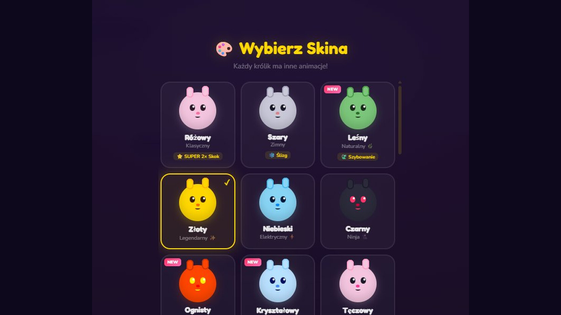 Pick your bunny! Each skin has unique visual effects. Pink leaves sparkles, Gold shimmers, Ninja creates shadow clones, Lava leaves a fire trail, and Rainbow changes colors with every jump. Unlock skins with coins, DLC packs, or the Battle Pass.