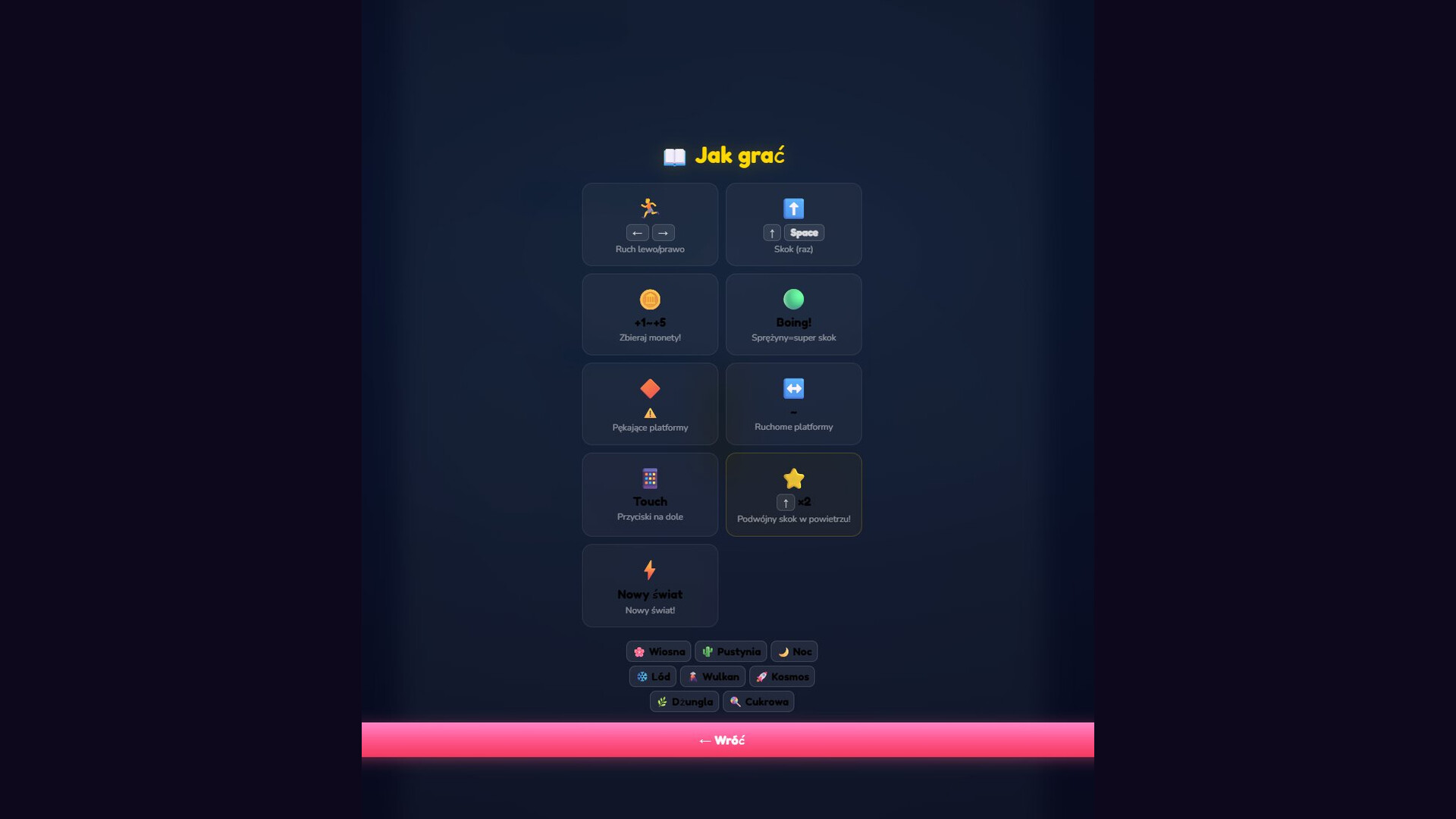 Climb through Spring, Desert, Night, Ice, Volcano, Space, Jungle and Candy Land. Each world changes colors, backgrounds, and difficulty. Every 50 points — a new world.