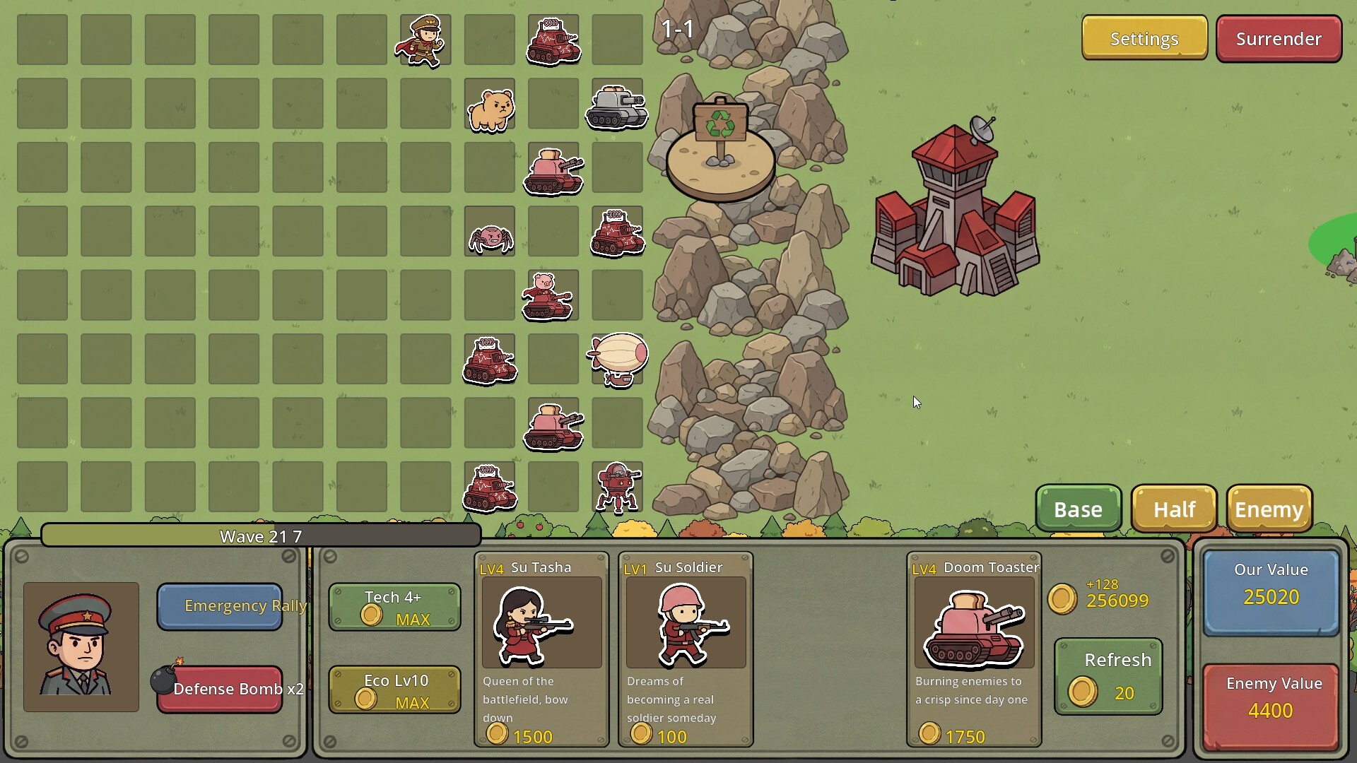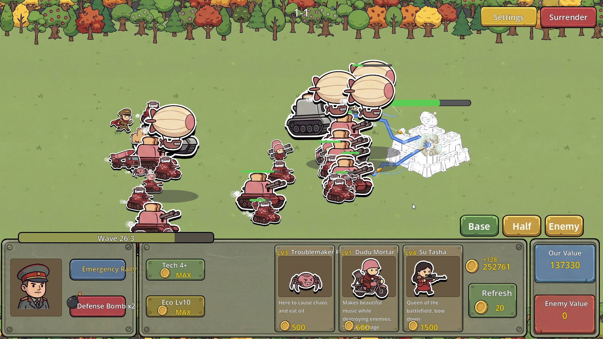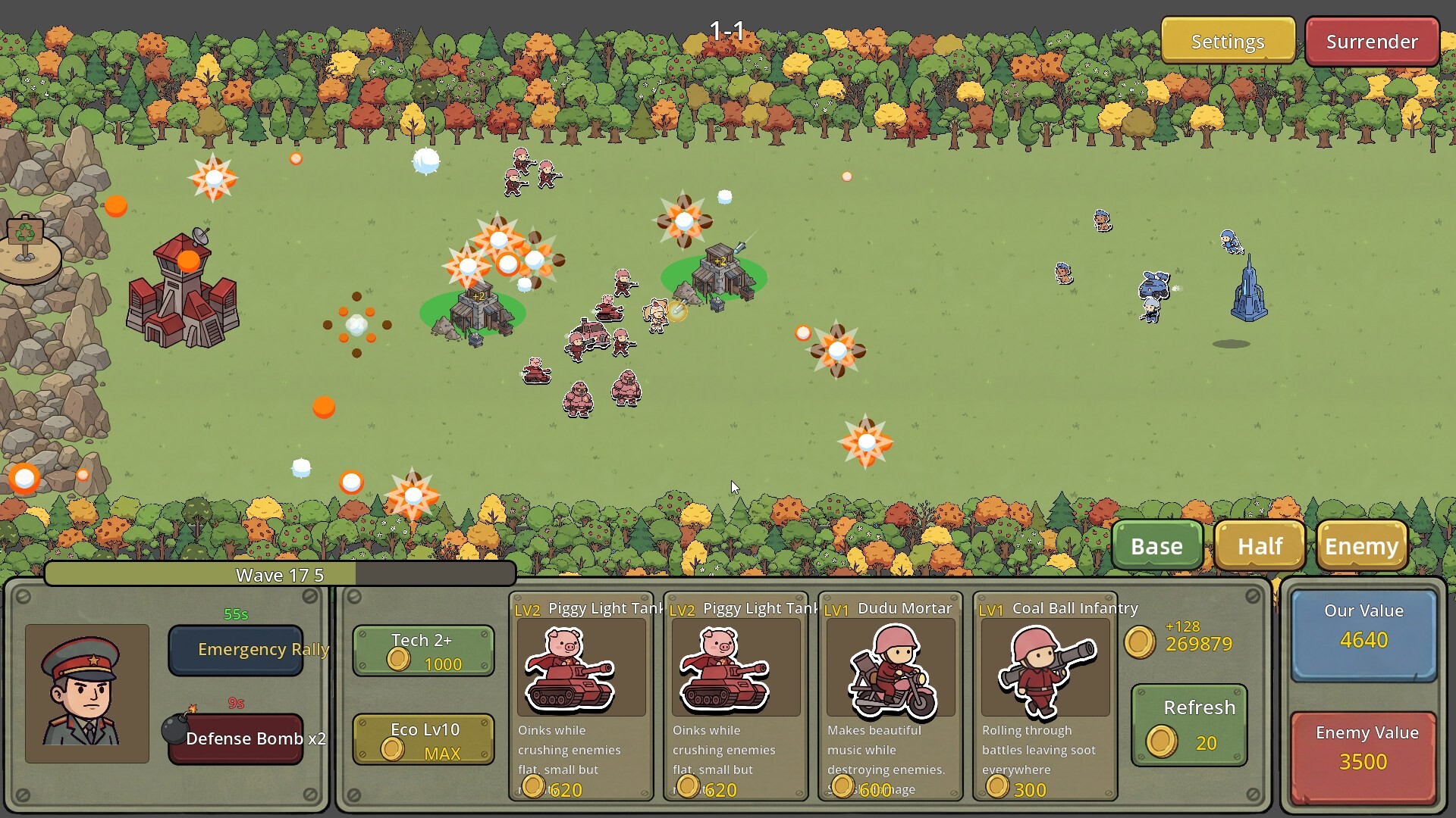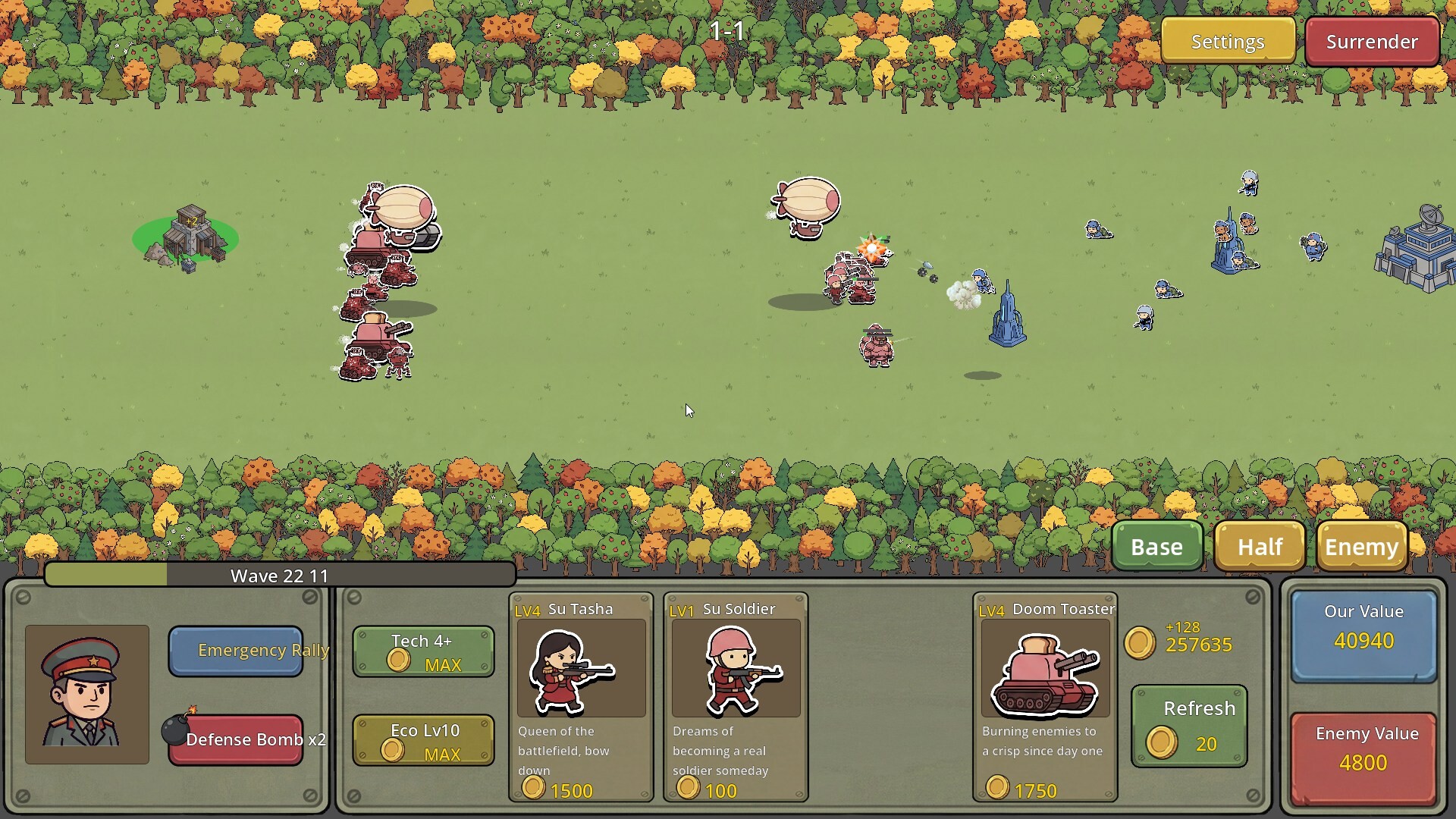 모에군과 수군, 스타일이 완전히 다른 두 귀여운 진영이 마침내 전쟁을 시작합니다! 전장에는 연기가 자욱하고, 양측 대군이 기지에서 쏟아져 나와 레인에서 격렬하게 교전합니다. 쉴 새 없이 날아오는 탄막, 끊임없이 터지는 스킬 이펙트, 순식간에 변하는 전황 — 여러분이 지은 모든 건물, 생산한 모든 부대가 이 장대한 대규모 회전에 합류합니다.