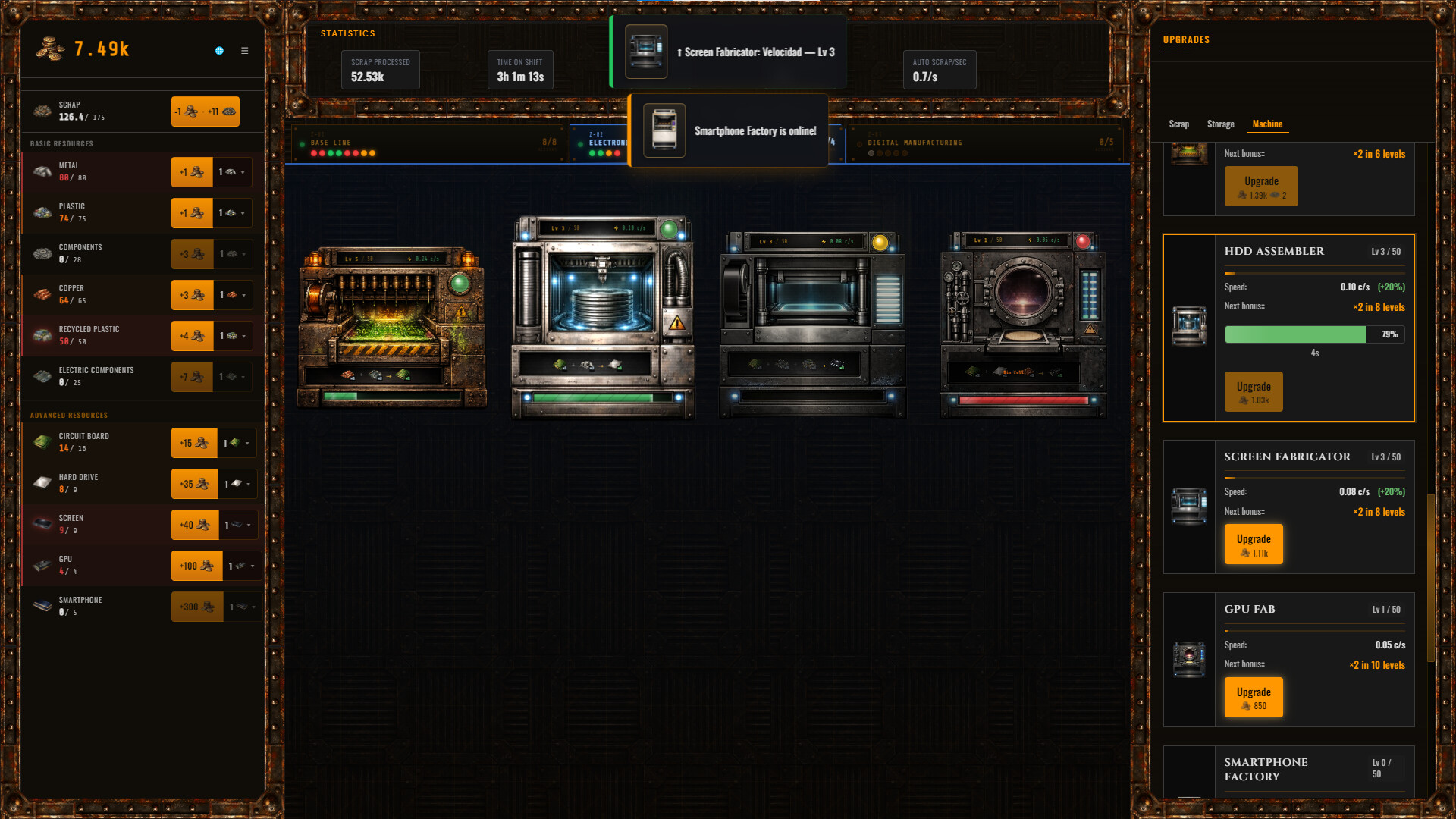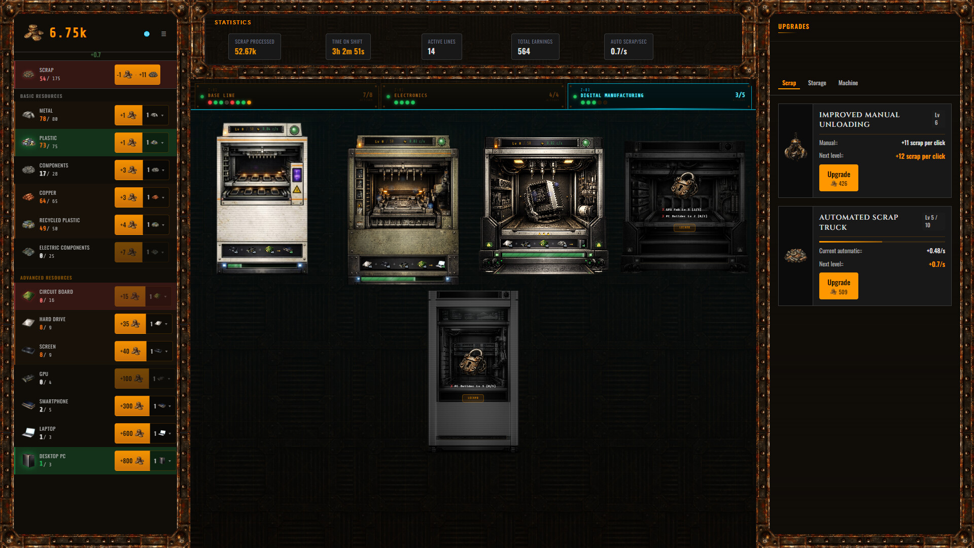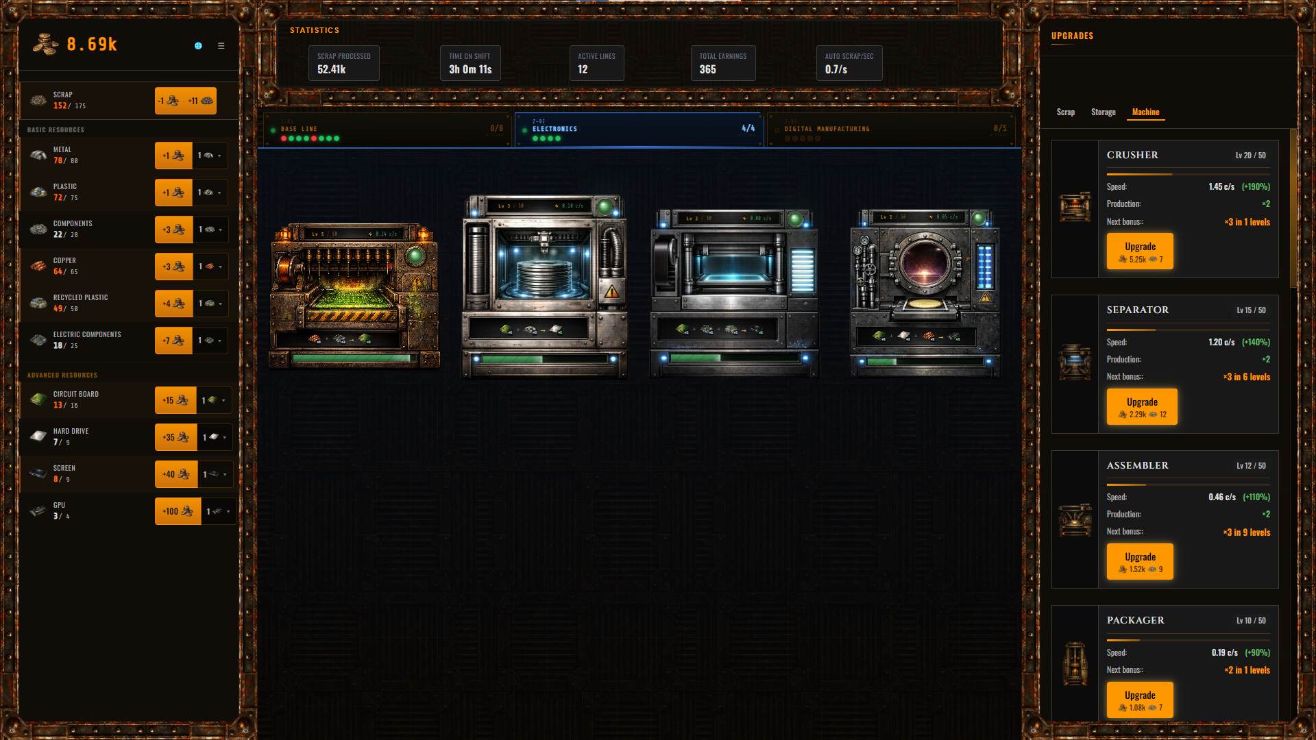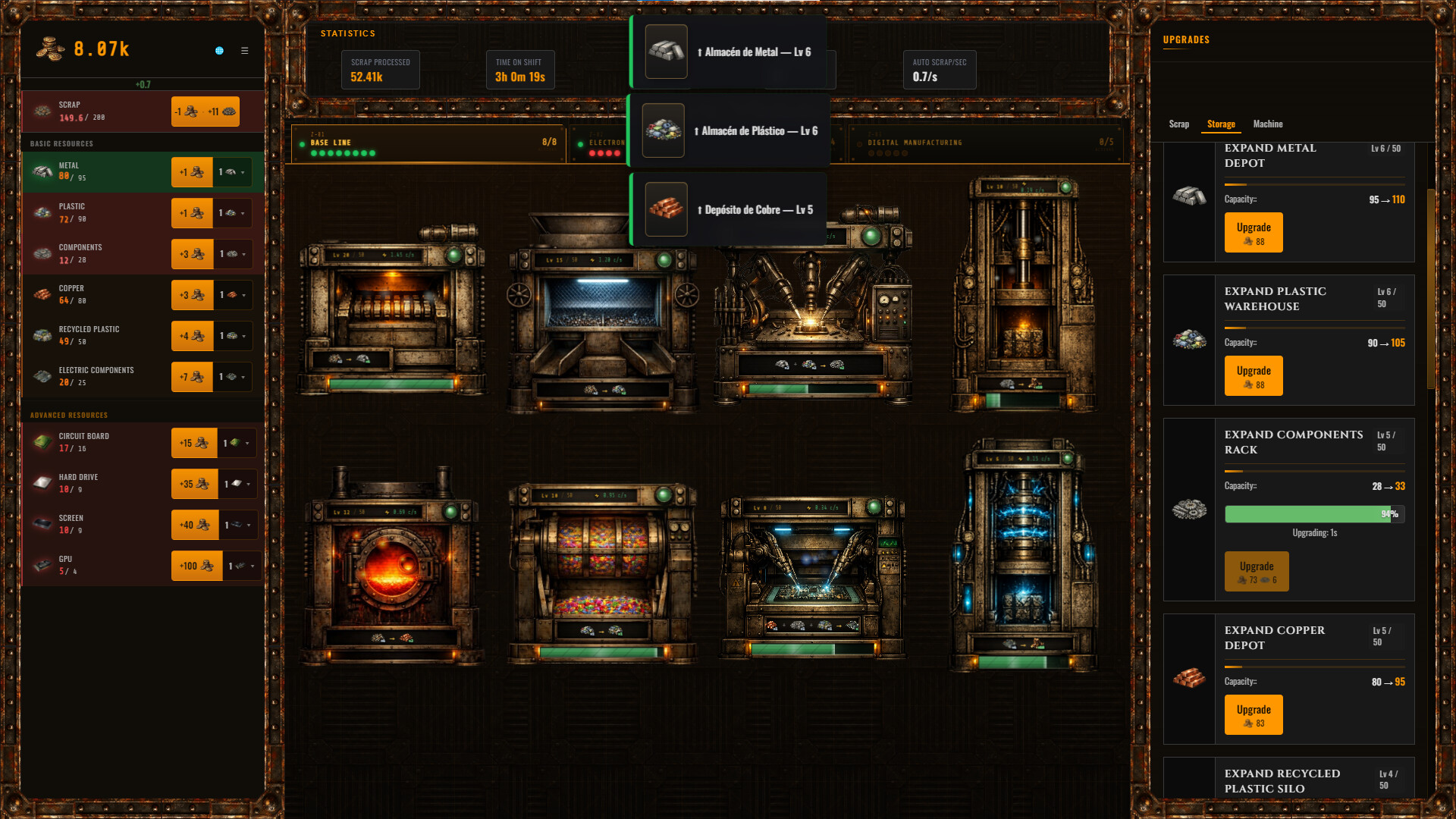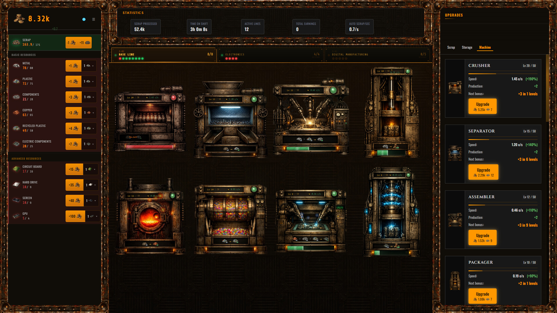 Start from nothing, manually collecting scrap piece by piece, and transform it into a fully automated industrial system. Every click matters at the beginning — but over time, your machines will take over.