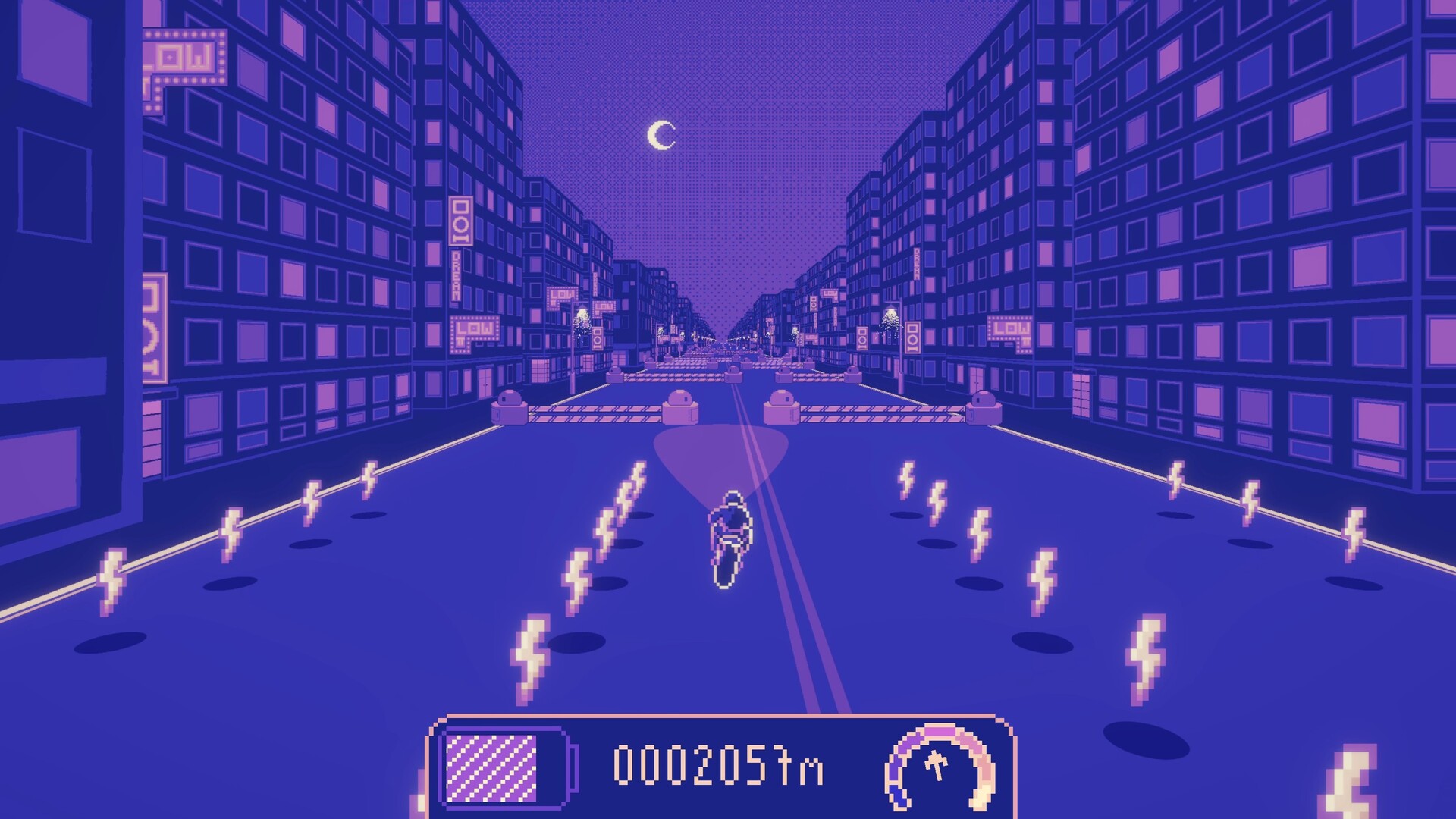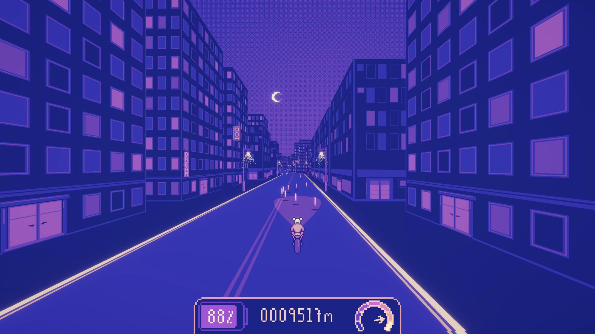 How far will you make it on the Midnight Road? Test your reflexes and endurance on an endless procedurally generated road full of obstacles! With all punch and no brakes, your bike accelerates even as the difficulty ramps up over time. Challenge yourself against your personal best, compete for a top spot on the online leaderboard, or form a crew of friends to see who's fastest! And don't worry—even when you crash, you'll unlock key story moments and groovy new driving tunes as you piece together the world of the Dream Riders.