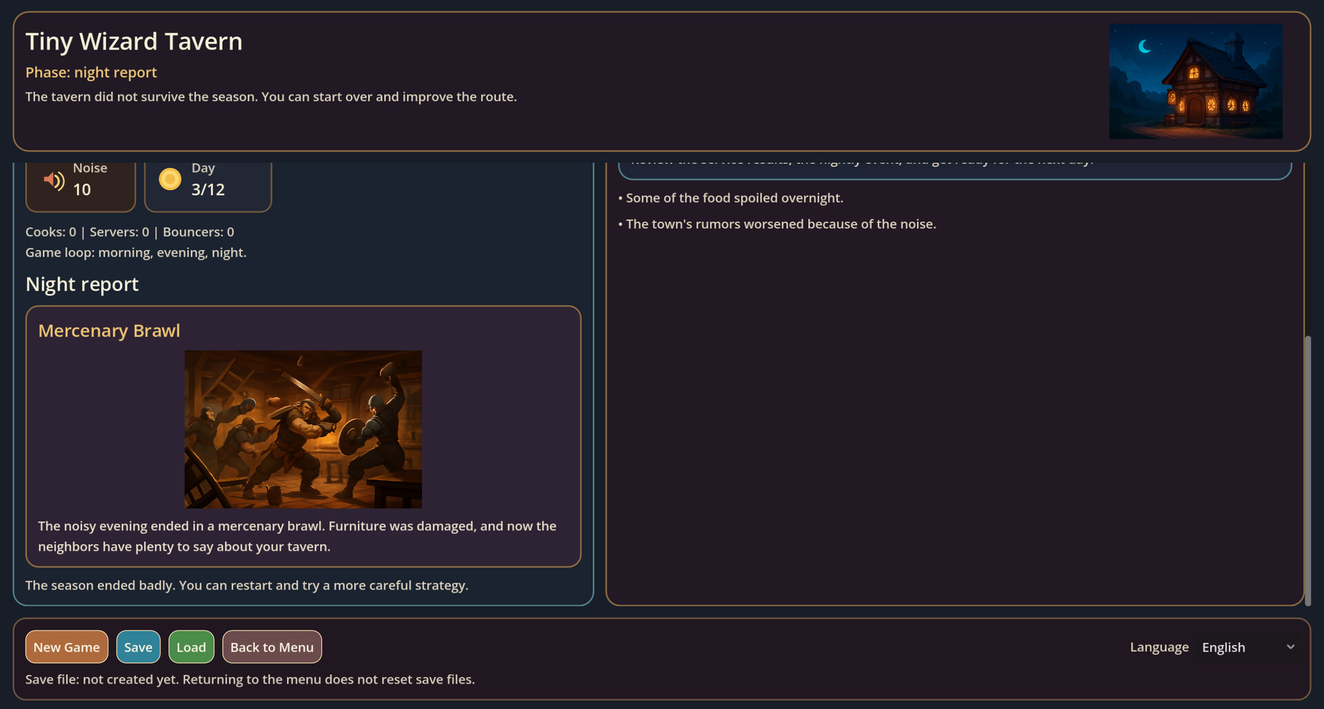Buy food, ale, and herbs in the morning, prepare for the evening rush, and welcome a colorful mix of travelers: mages, merchants, mercenaries, bards, and pilgrims. Each guest has their own needs, mood, and traits, so every evening becomes a small story.