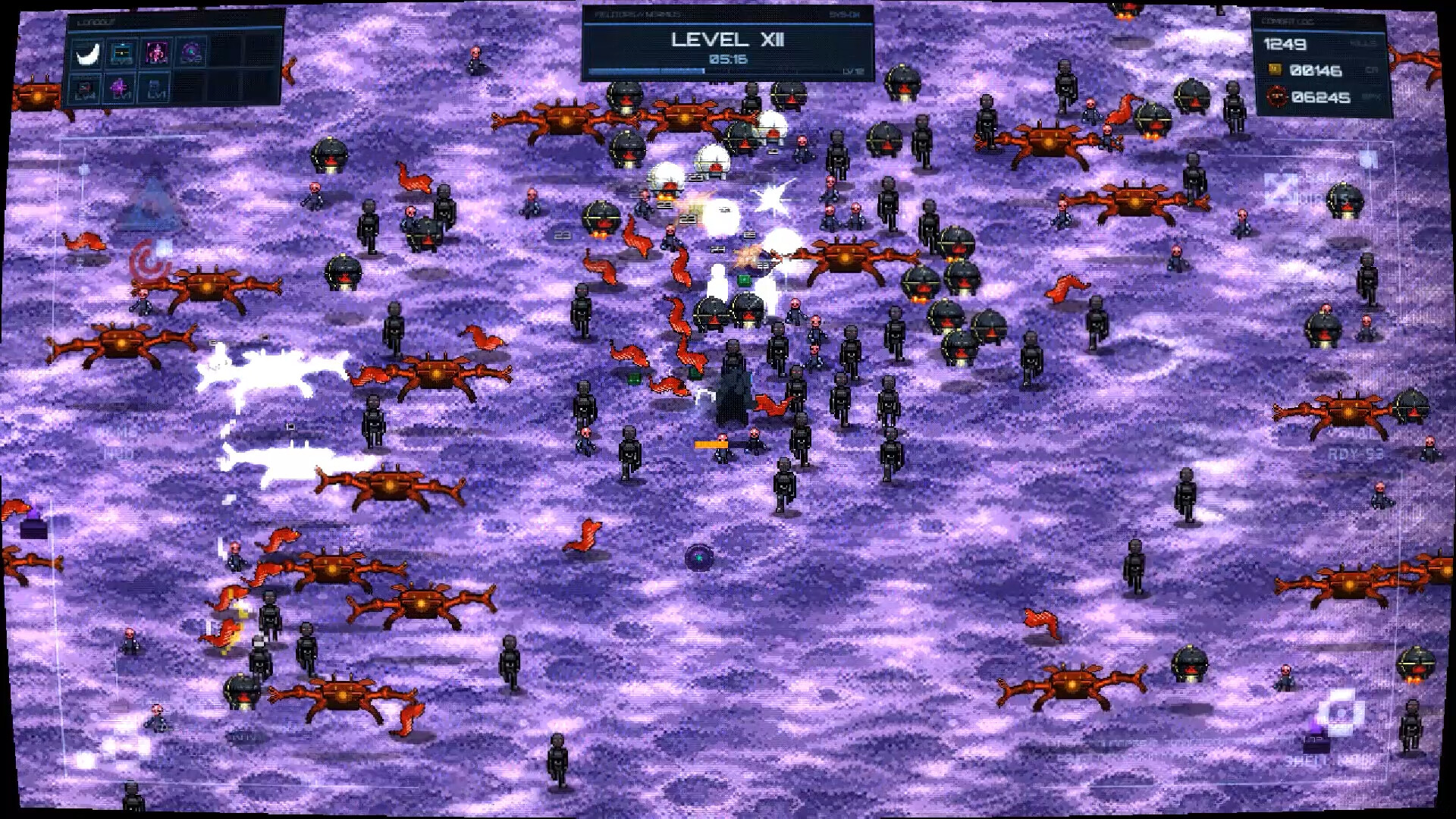 Survive escalating waves. Level up mid-run. Stack dozens of weapons and passives. Reach the boss. Die. Spend credits. Deploy again stronger.