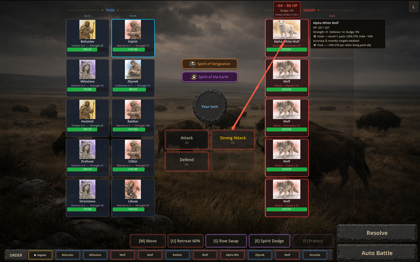 Not every threat can be avoided. Tactical turn-based combat awaits on the road south, where your tribe's composition, positioning, timing, and abilities all determine who lives and who doesn't. Strength alone won't save you. You'll need to adapt, improvise, and live with the consequences of your choices.