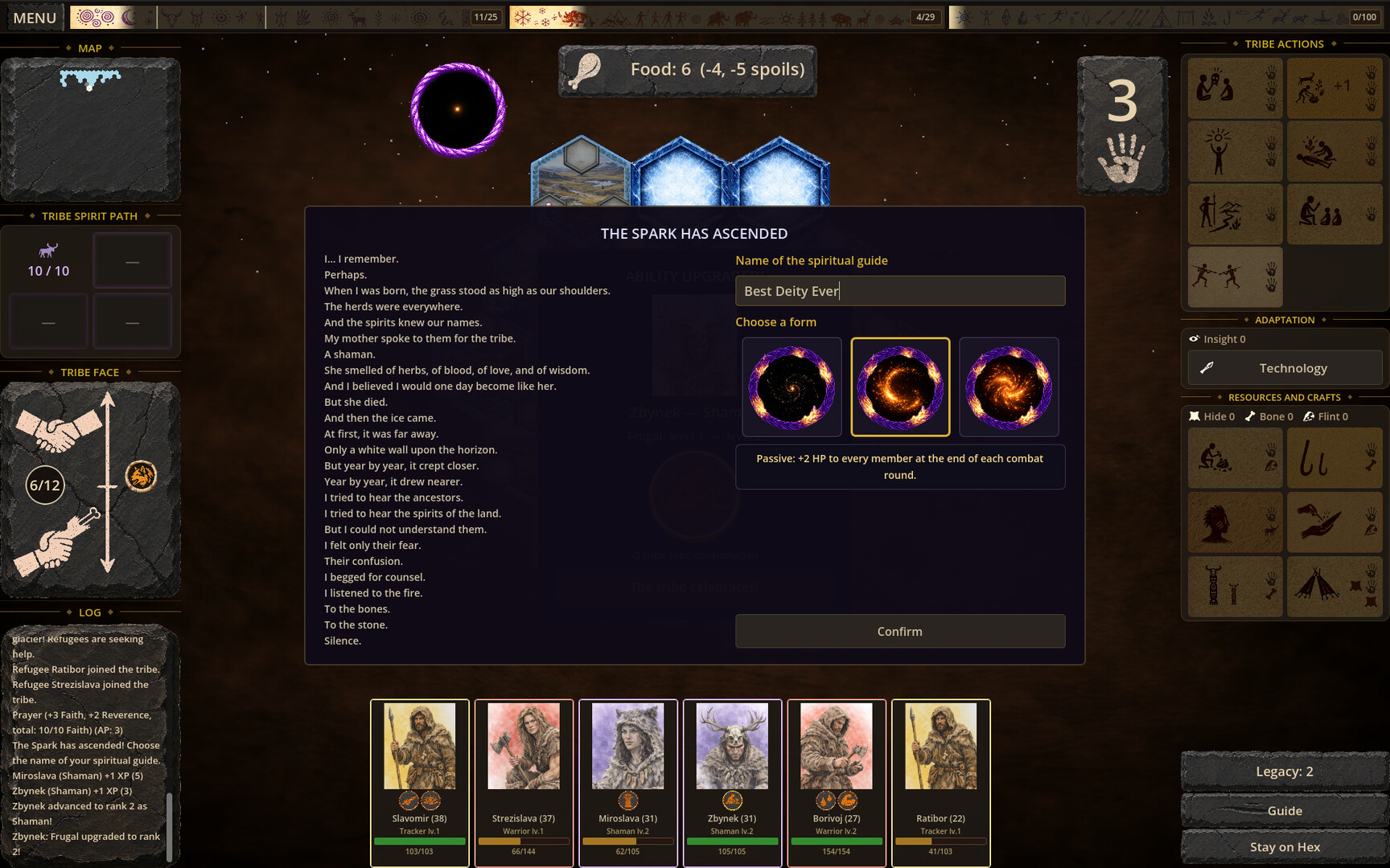 Every turn is a decision. Will you gather supplies, tend to the wounded, develop new technologies, strengthen your people's faith — or venture into the unknown? Your tribe evolves with each expedition: members gain roles, traits, and scars, and new discoveries can forge a stronger, more resilient community.