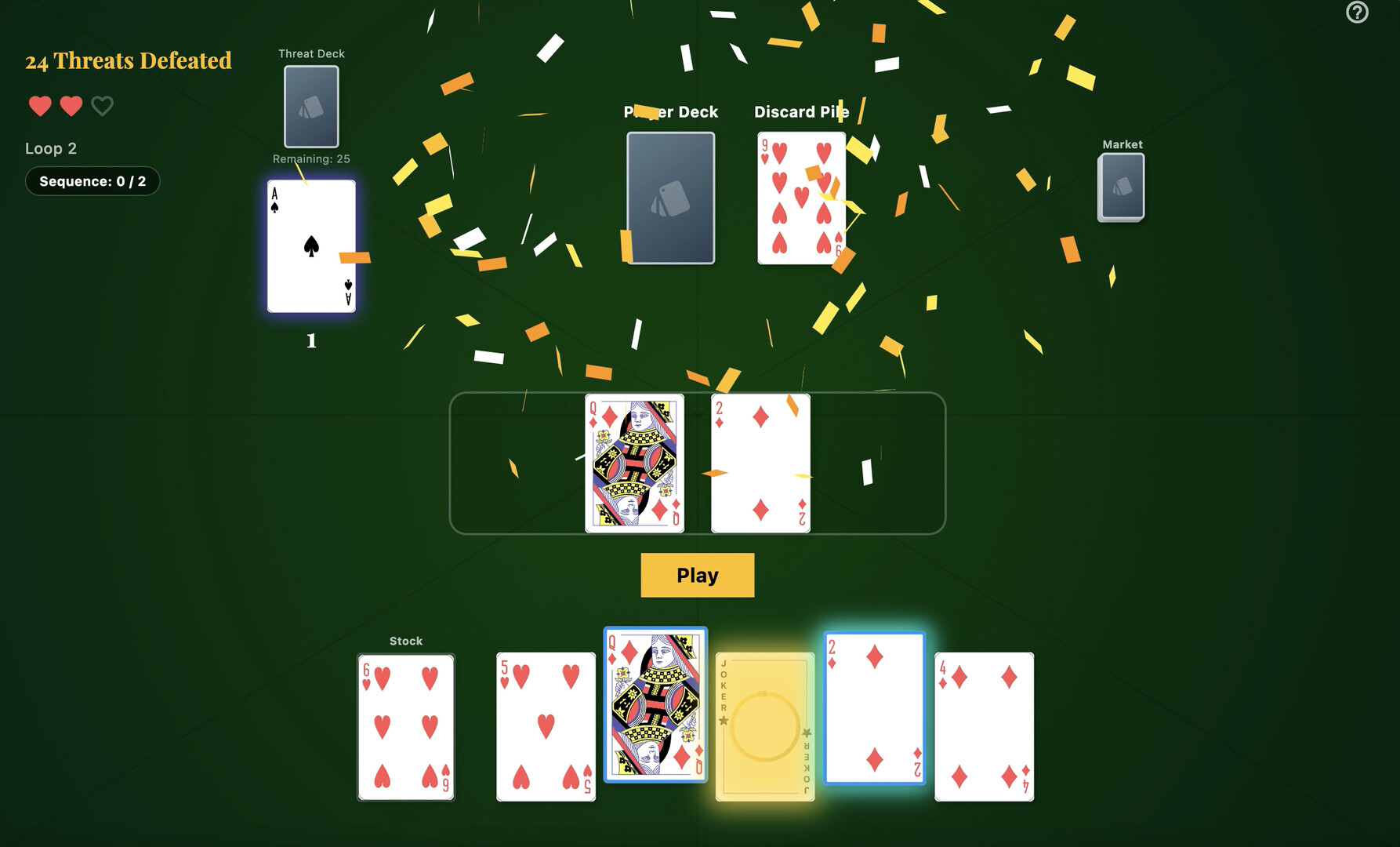 🔄 Deck Building via the Chaos Market (Swap) When you defeat an enemy, you must swap one of your played cards with an unknown card from the market. Enjoy a dilemma-filled deck-building experience where the chance to gain powerful face cards comes with the risk of ruining your deck's balance.