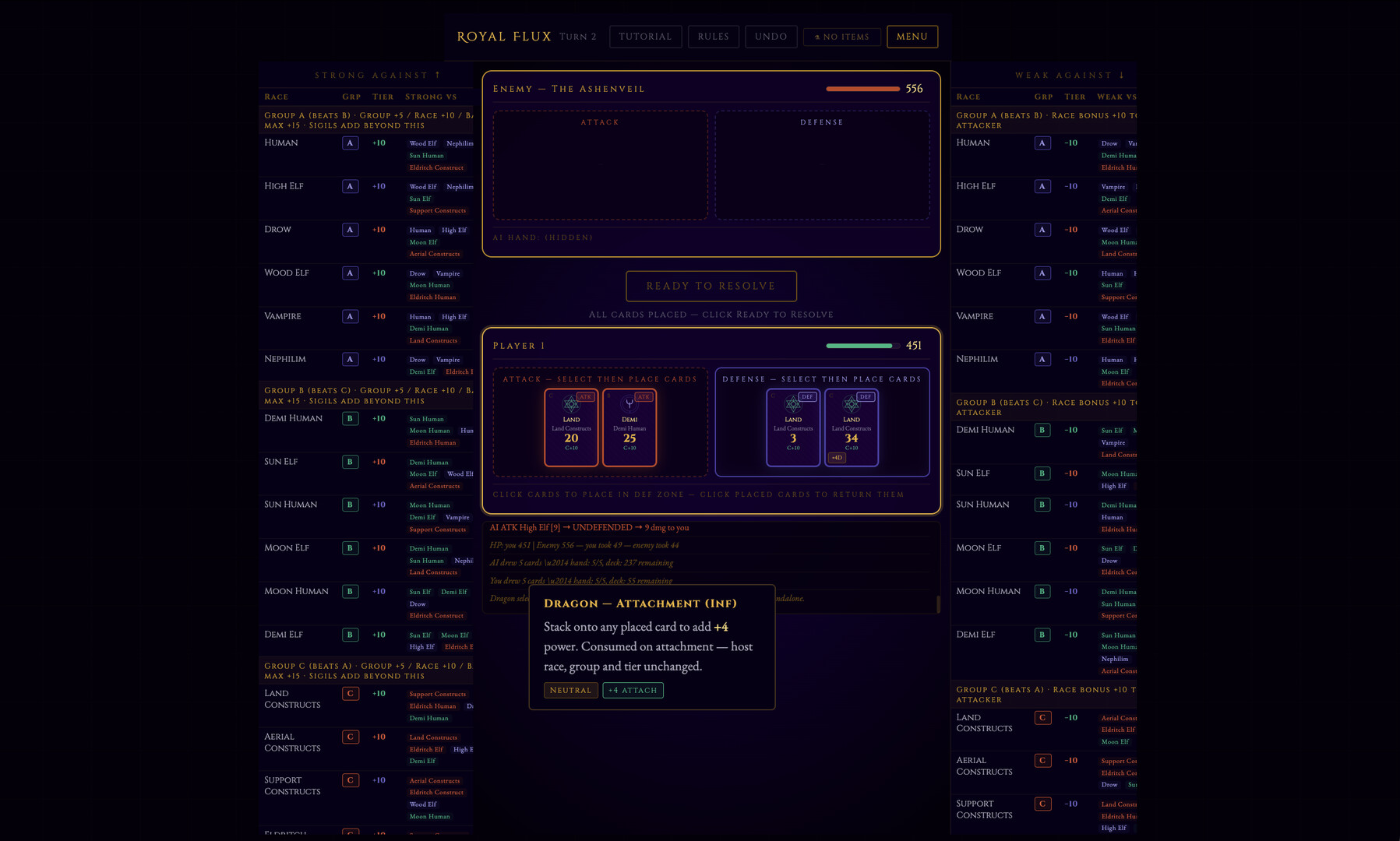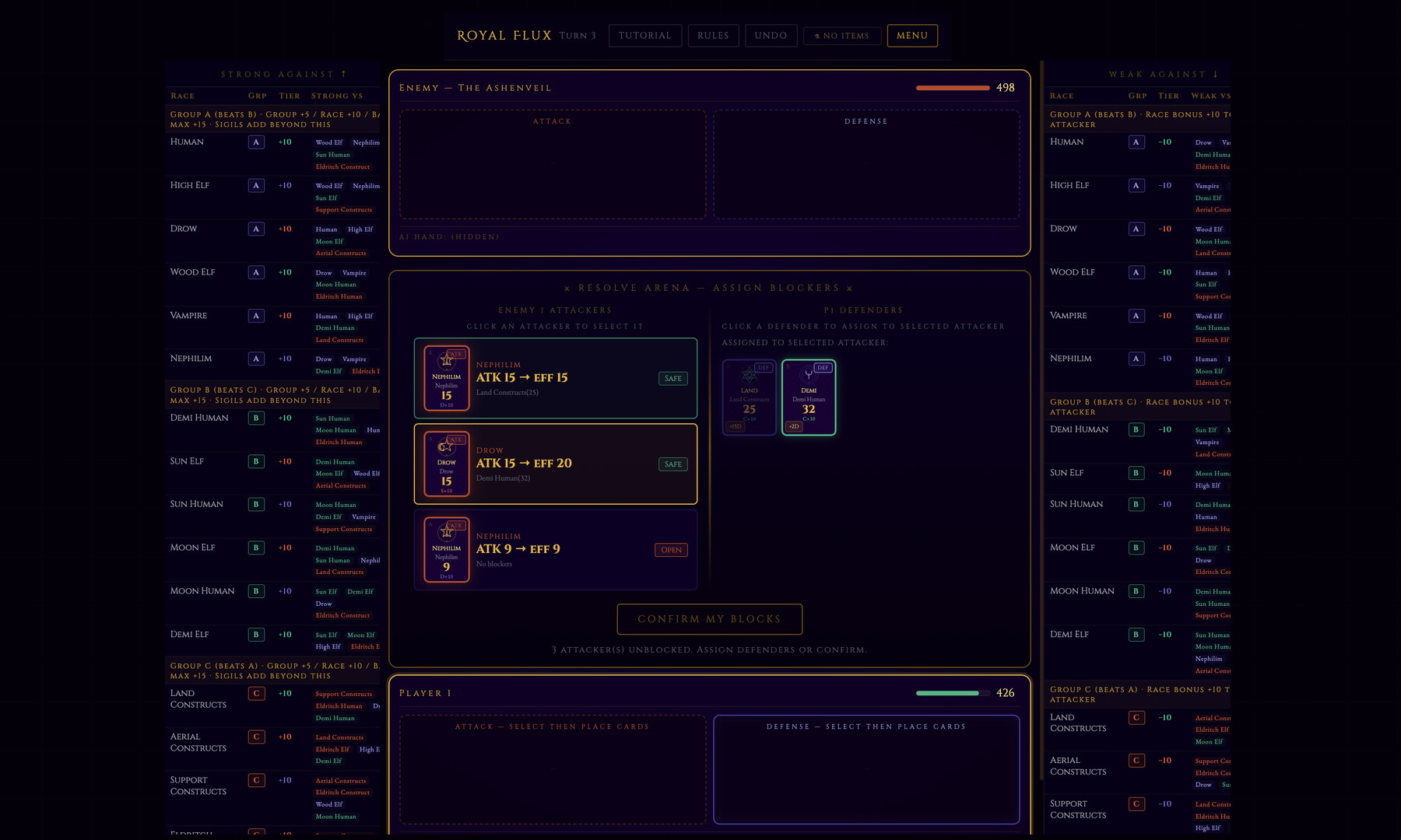 At the heart of Royal Flux is a three-kingdom group bonus system called The Differential Engine. Ashenveil beats Solarch. Solarch beats Null Foundry. Null Foundry beats Ashenveil. A winning group matchup grants a +10 power bonus to the attacker — a swing large enough to flip the outcome of any zone.