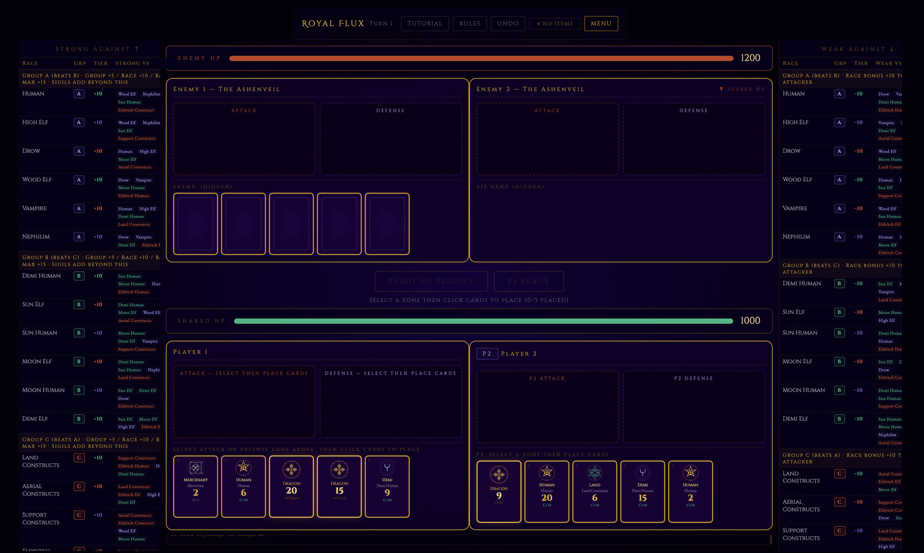 Royal Flux is a turn-based card battle game where both sides place simultaneously — you never know exactly what your opponent is committing until combat resolves. Victory belongs to the player who reads the board, builds the better deck, and understands the kingdom triangle before the damage is done.