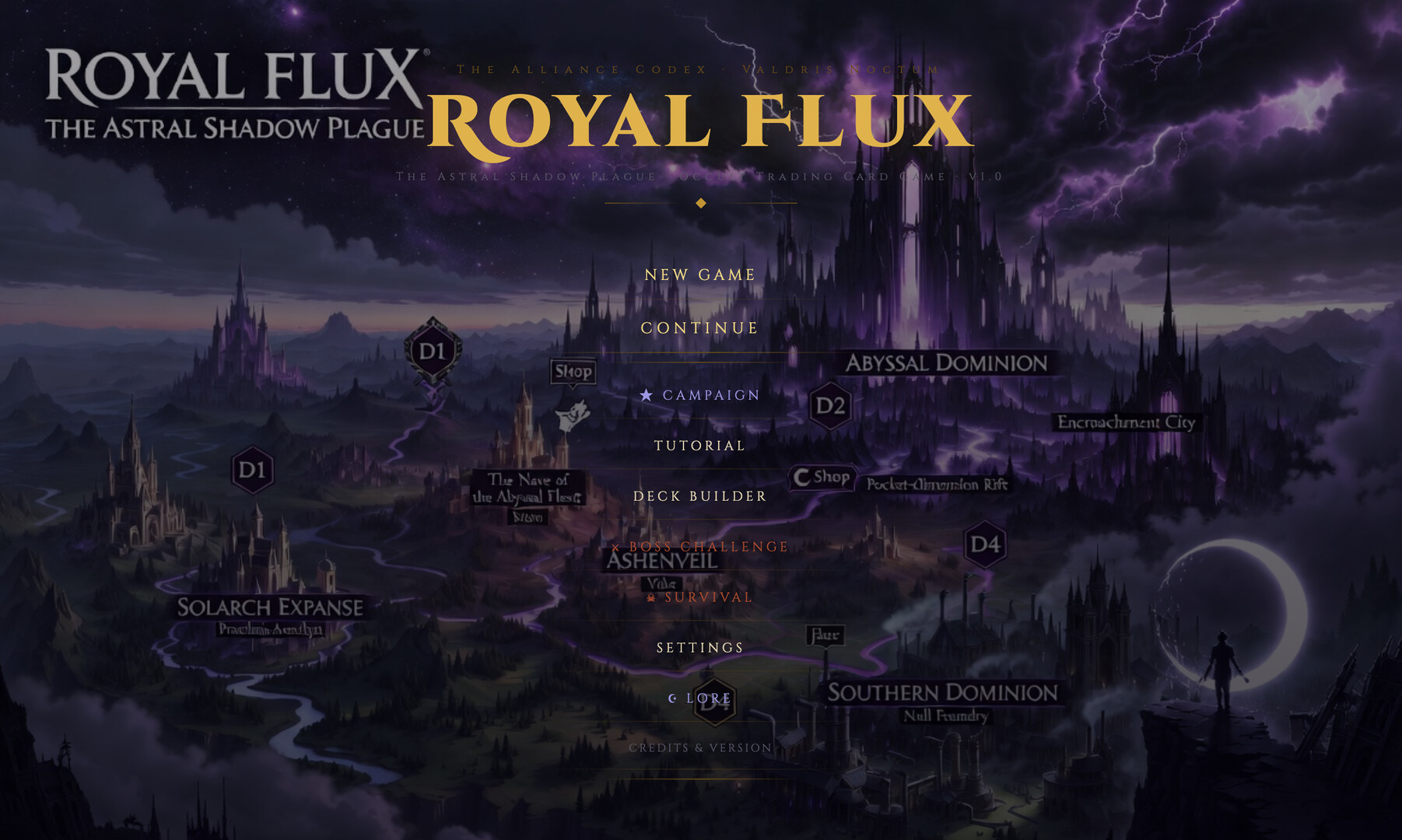 Every title in development at Arcane Architecture begins as a proprietary mechanical design — a system that solves a real problem with existing games. Royal Flux addresses the balance failures endemic to collectible card games by replacing pack-driven economies with a matrix-based deck construction engine.