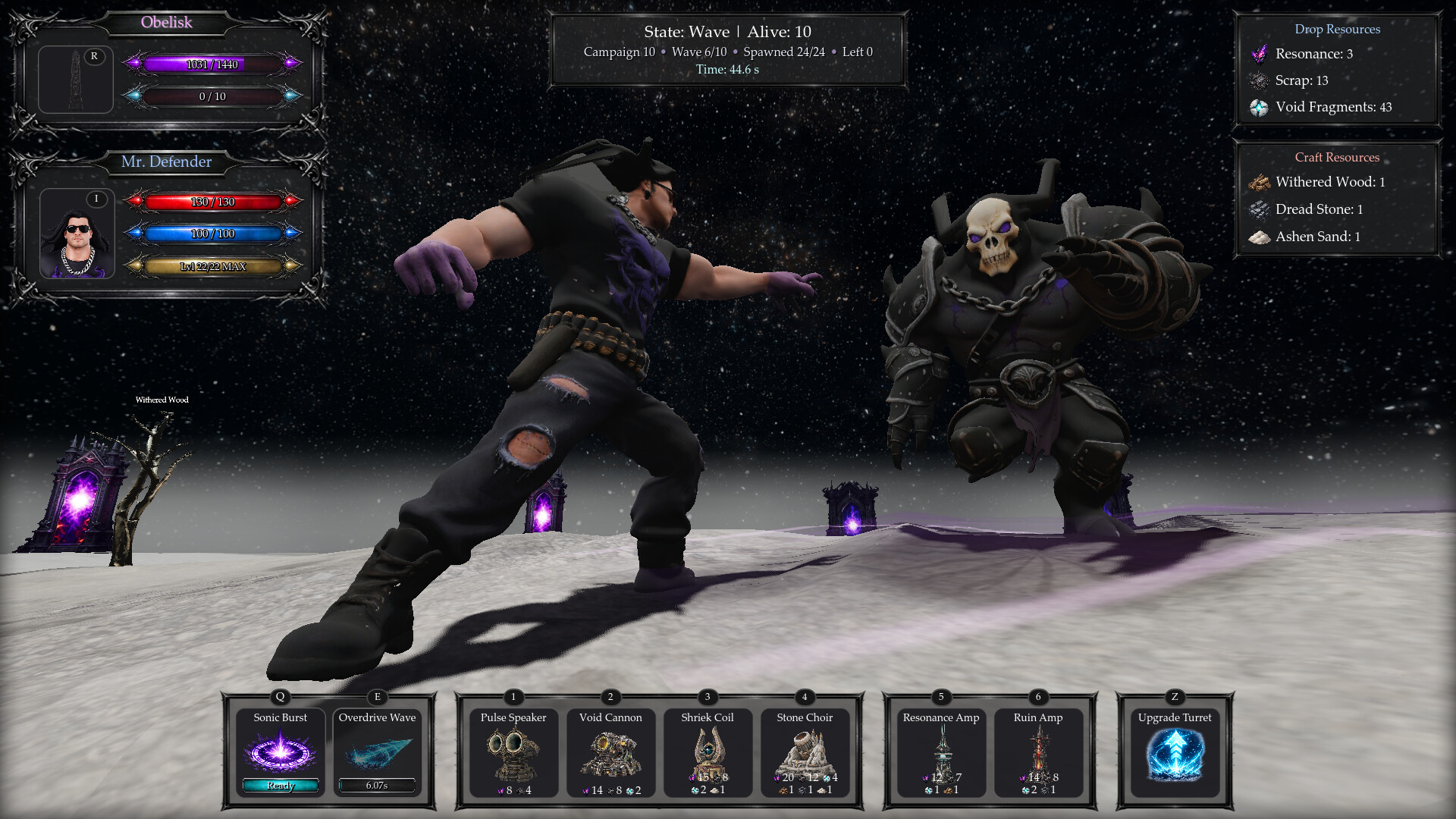 당신은 소리를 무기로 바꾸는 록 뮤지션이 됩니다. 원거리 음파 공격을 사용하고, 강력한 액티브 능력을 해방하며, 전투 한가운데서 자원을 모으고, 오벨리스크 주변에 방어 시설을 구축하세요. 이것은 수동적인 기지 방어가 아닙니다. 영웅은 언제나 전투의 중심에 있으며, 전장에서의 실수 하나가 패배로 이어질 수 있습니다.