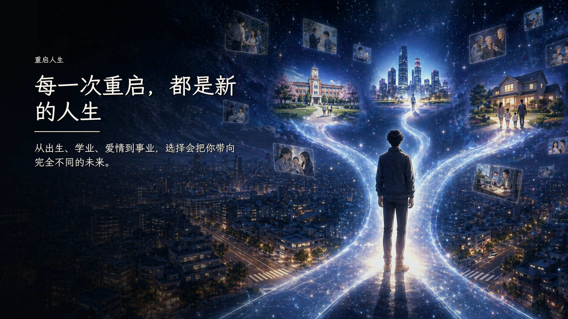 Restart Life is a life-sim visual novel where you wake in a soul space, spend destiny points, and live a complete life from age 0 to 100.