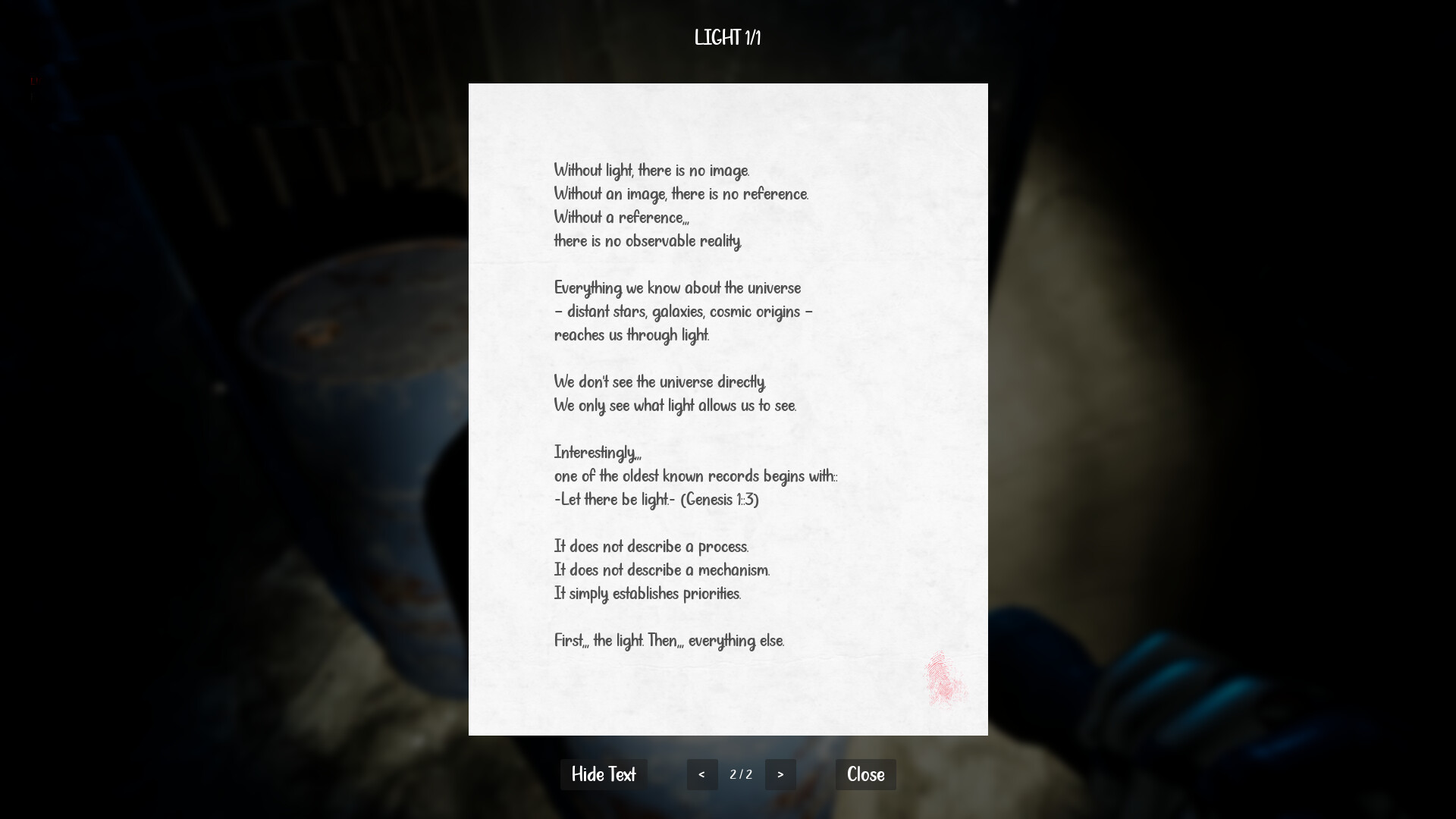 Armed with nothing but a AI-Flashlight, you will traverse abandoned environments, uncovering a vast collection of notes scattered throughout the world. These writings form the core of the experience—rich, thought-provoking, and carefully structured to guide your journey. Inspired by the environmental storytelling, every note invites reflection rather than reaction.