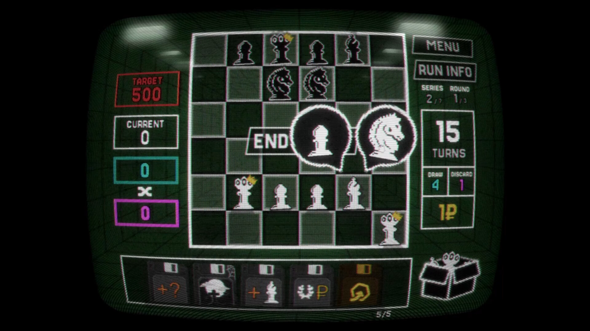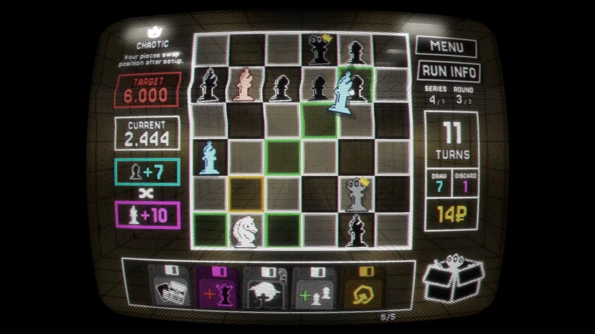 Craft endless builds from score-bending floppy disks, piece-box-altering zodiac cards and levelling wonder cards. From pawn swarms, to sacrifices, to one-man-armies: choose your upgrades carefully to bend the board and ignite explosive combos.