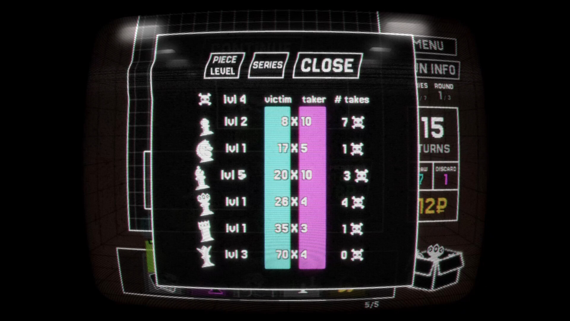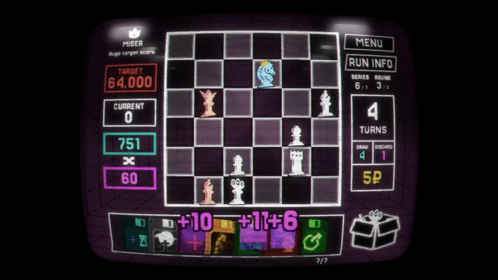 Light on chess, big on score. Play lightning rounds of minichess with ever-increasing score targets. Each capture scores points. Each round earns you cash to upgrade in the shop.