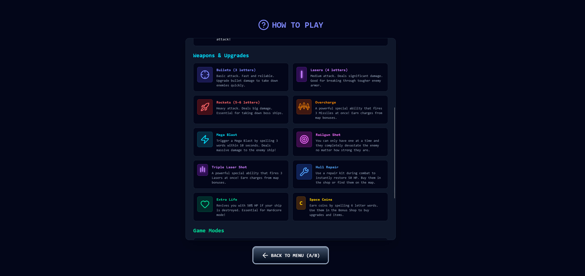 Spell 6 letter words to earn Space Coins, use them to unlock new abilities and upgrade your ship to become an unstoppable force.