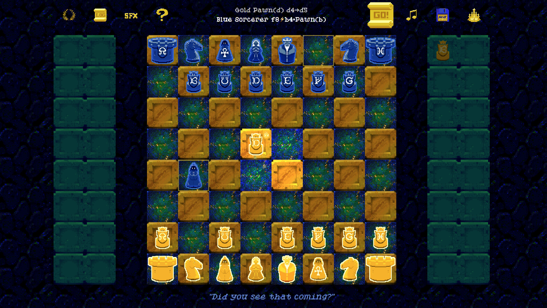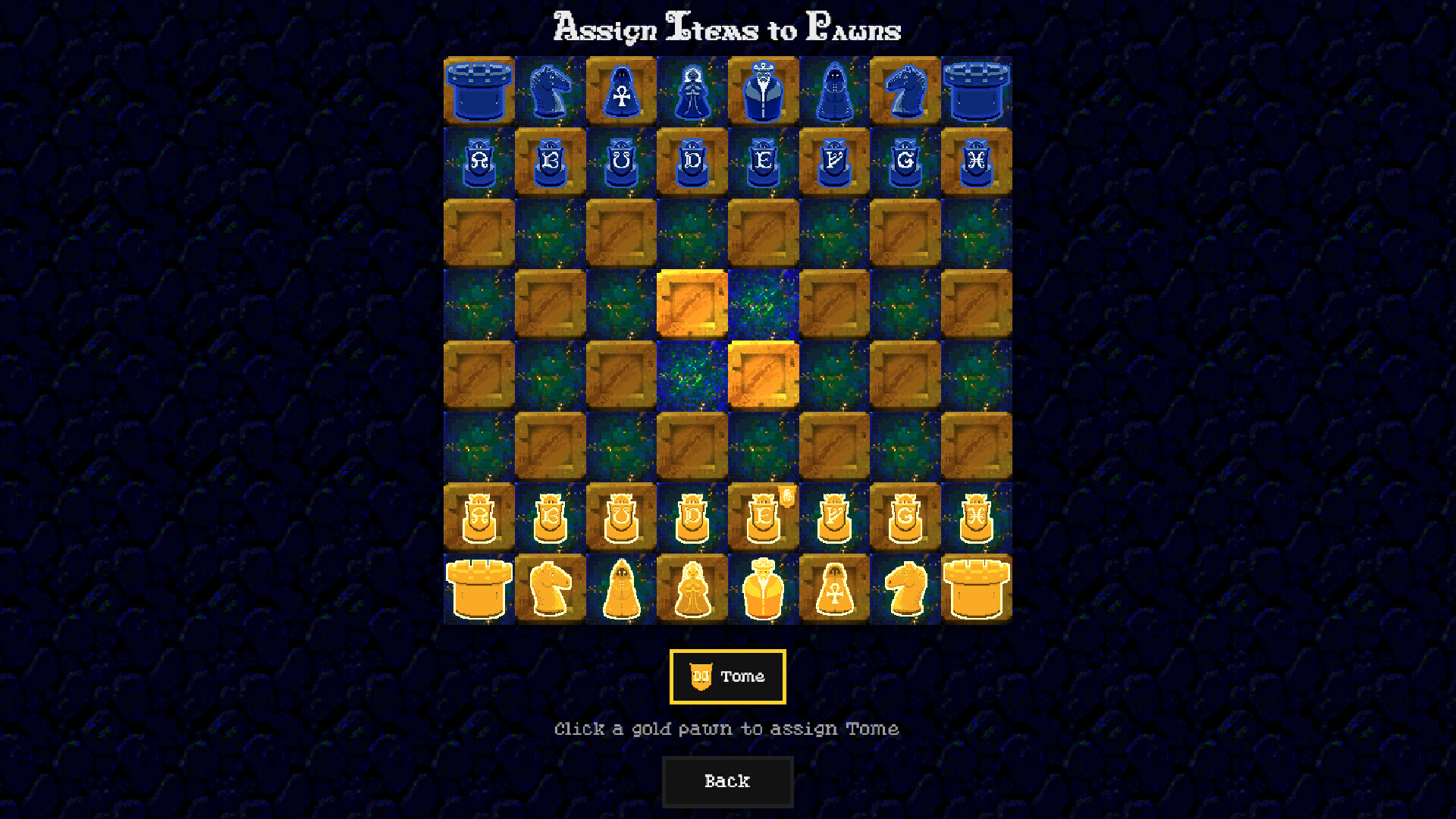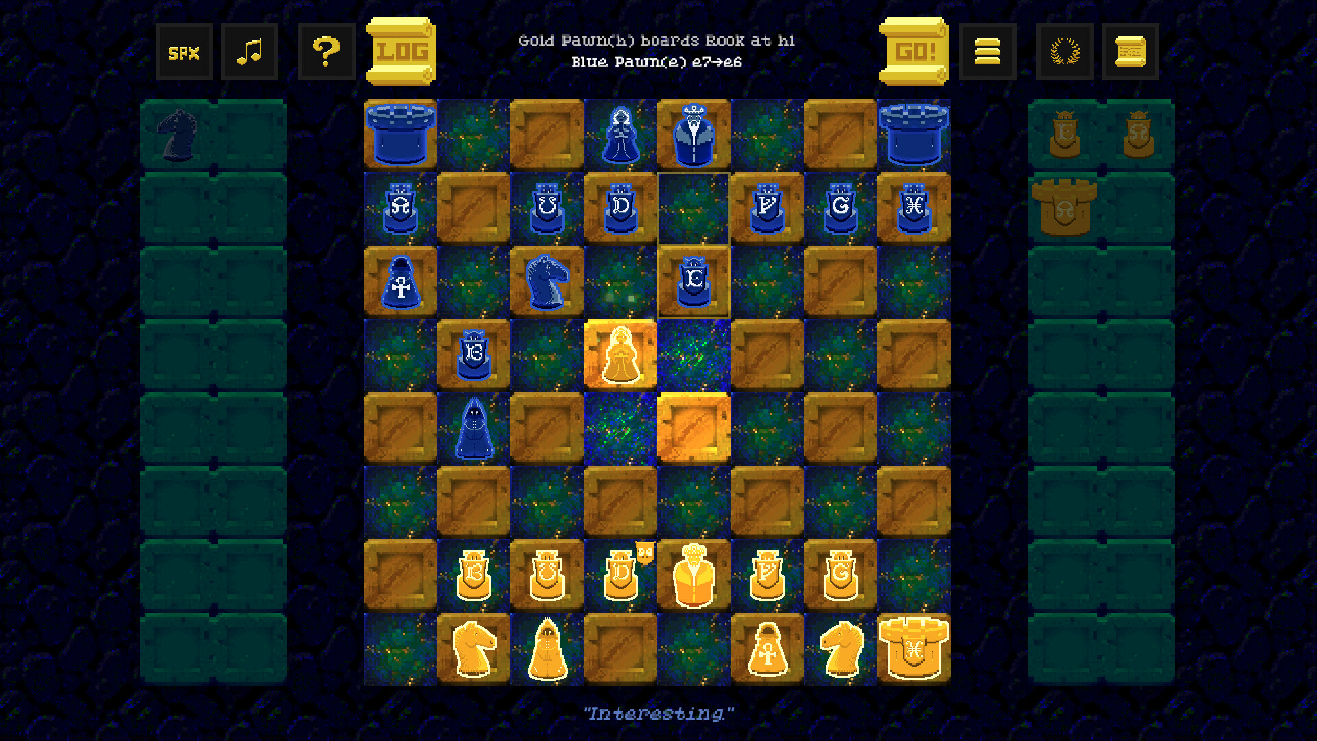 There's no check – no checkmate! Kings can be captured. Rooks can be boarded. And before every match, each player has the chance to equip the chests of up to three pawns with powerful arcane artifacts. Only you know which of your pawns chests are empty -- and which carry mighty magical items. Your opponent is up to the same tricks, tho! Thus, every pawn becomes a riddle to solve.
