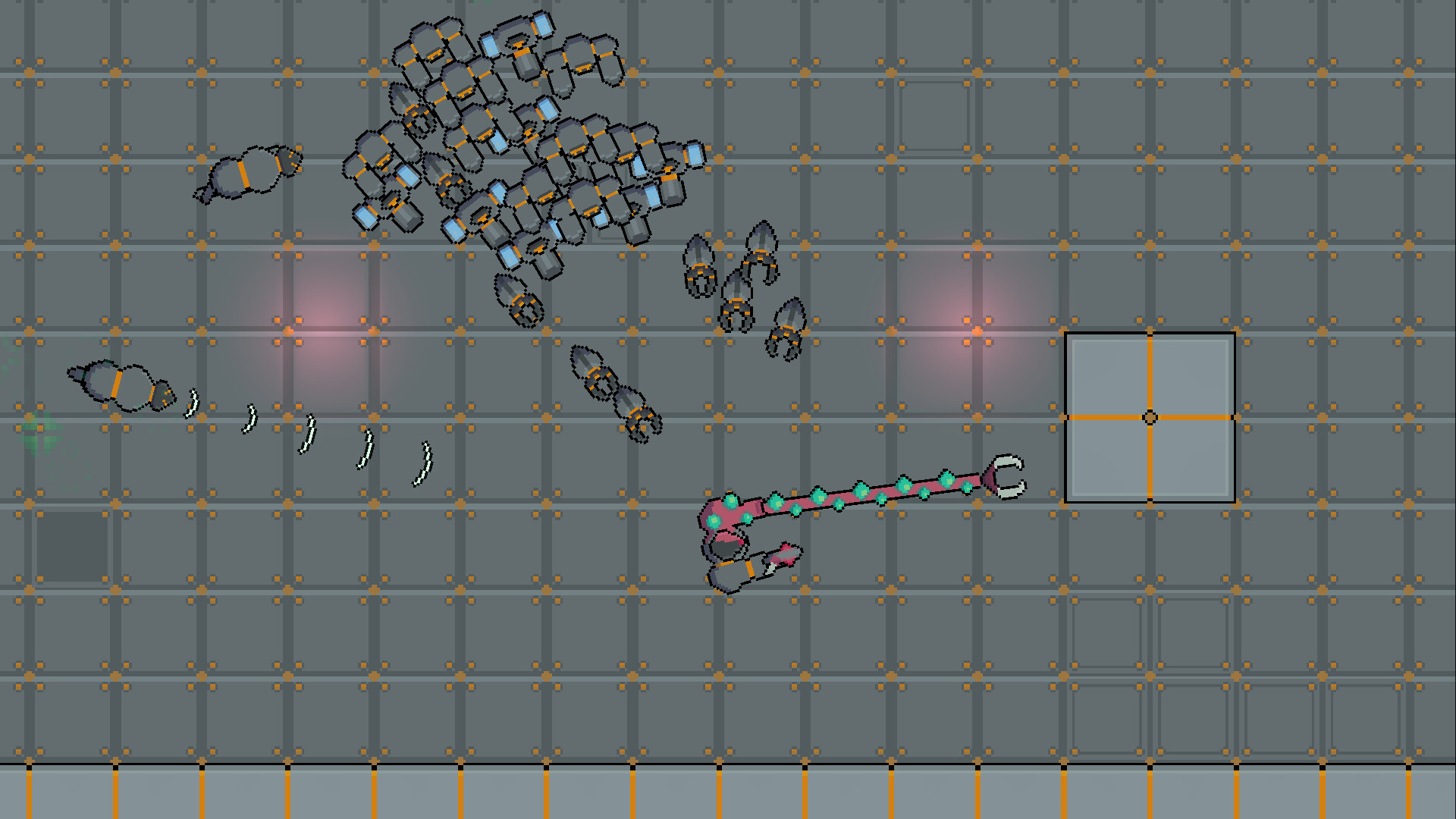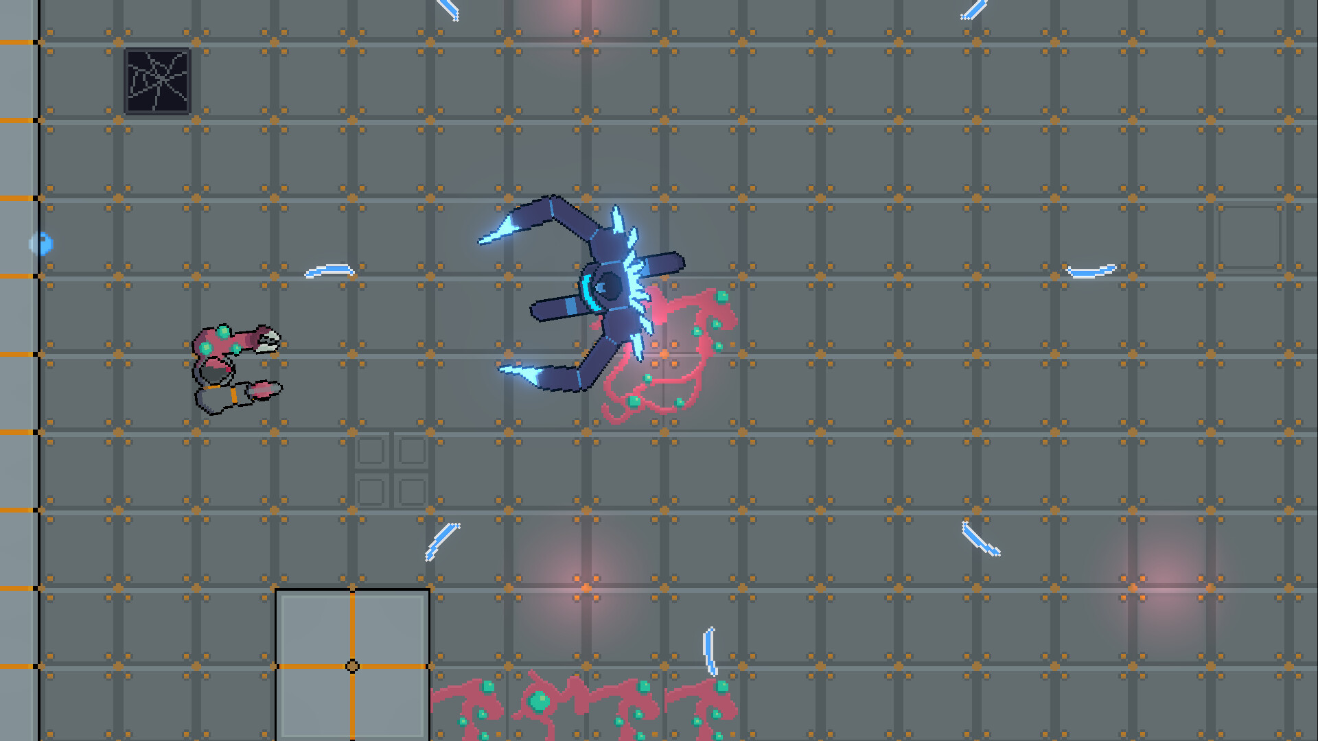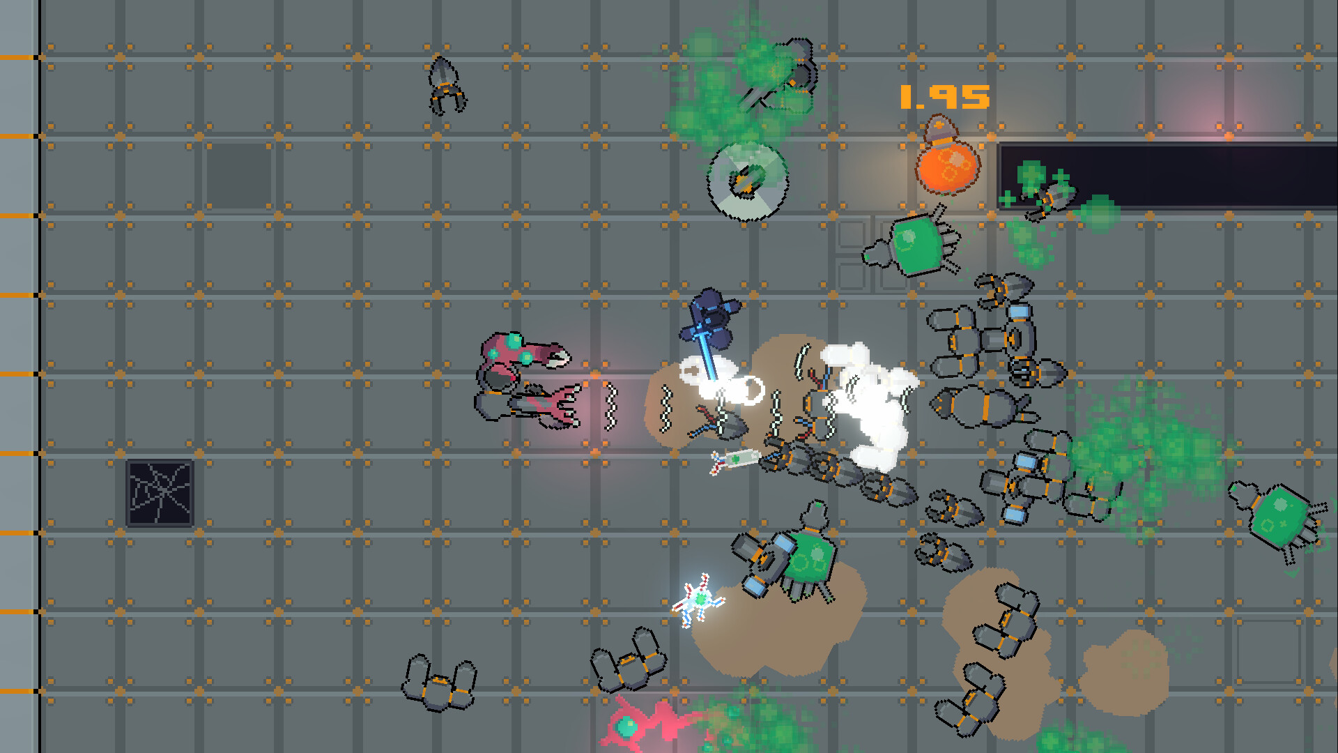 Hook and Gun is a brutal, fast-paced 2D top-down action roguelike set within the claustrophobic confines of a rising elevator. You are an alien invader that has breached a high-security robot factory. Your objective is simple: take control of a security unit, reach the top floor, corrupt everything in your path, and unleash yourself upon the world.