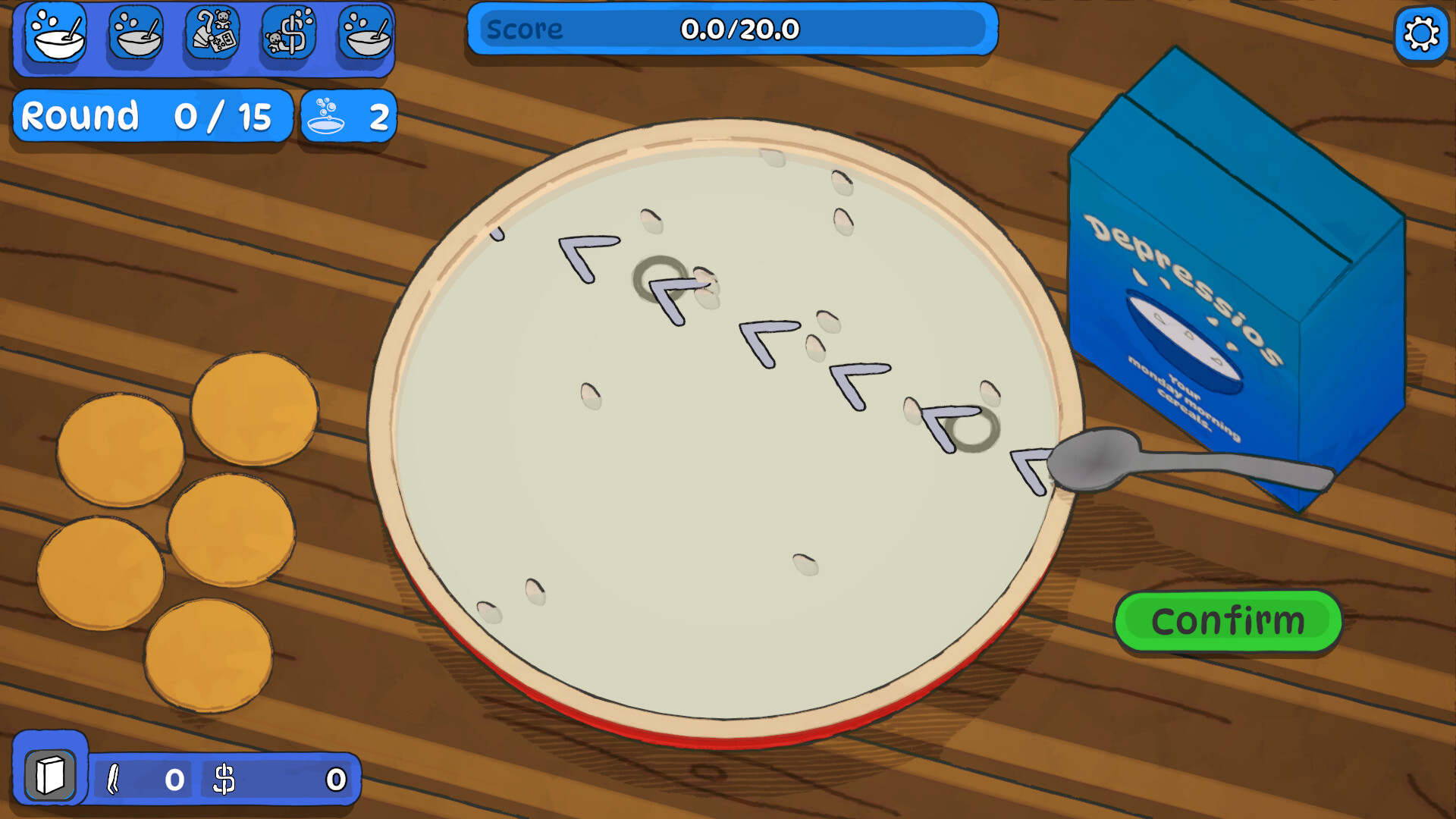 In this mode you will have to collect cereals from a bowl filled with milk with a spoon. These cereals are drawn from your box. Once collected you can rearrange them in the spoon to maximize their effects. Make enough points to beat the threshold and win the round.