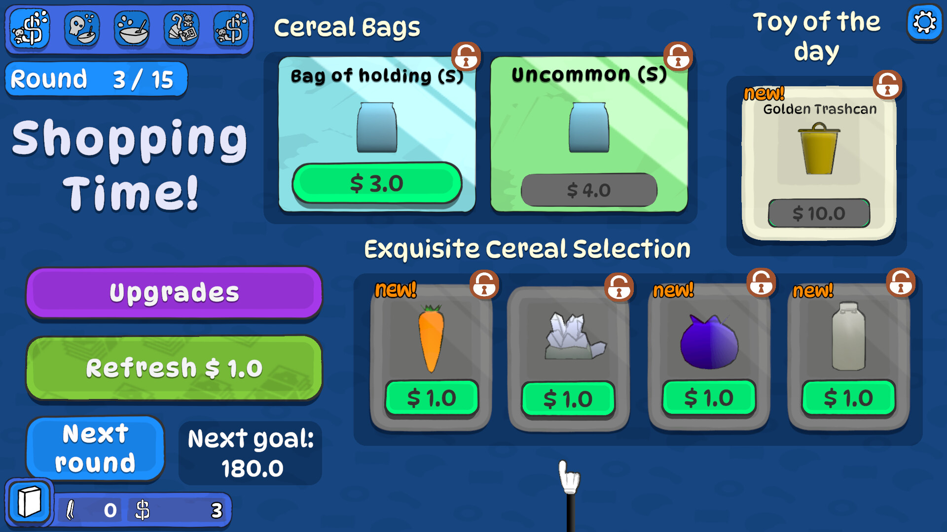 The game is divided into different types of rounds with a minimum threshold of points to surpass in order to win it. Each round rewards money that you can use to buy upgrades from an upgrade tree, more cereal and more toys.
