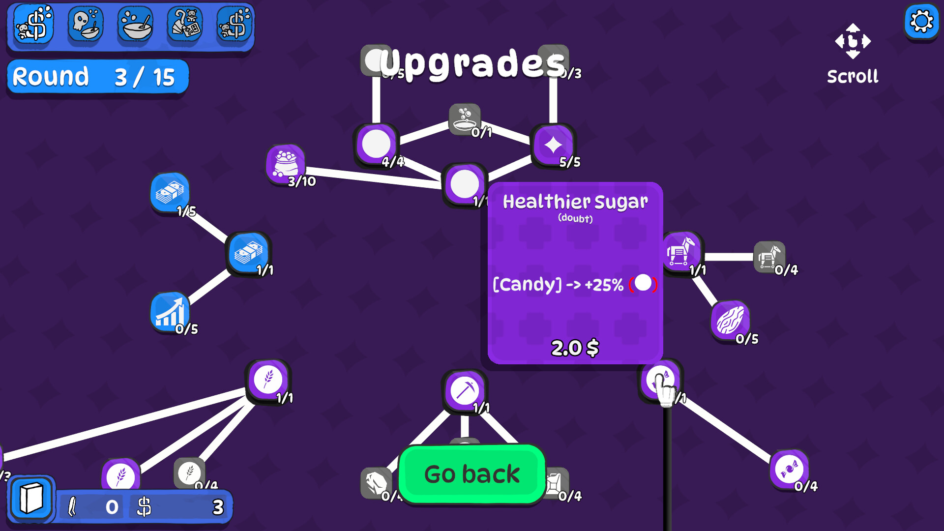 The upgrade tree contains both generic, unique or repeatable upgrades like more money awarded, more points and more specialized branches for a specific cereal theme. Want to make a build around farm themed cereals? They have their own upgrade tree.