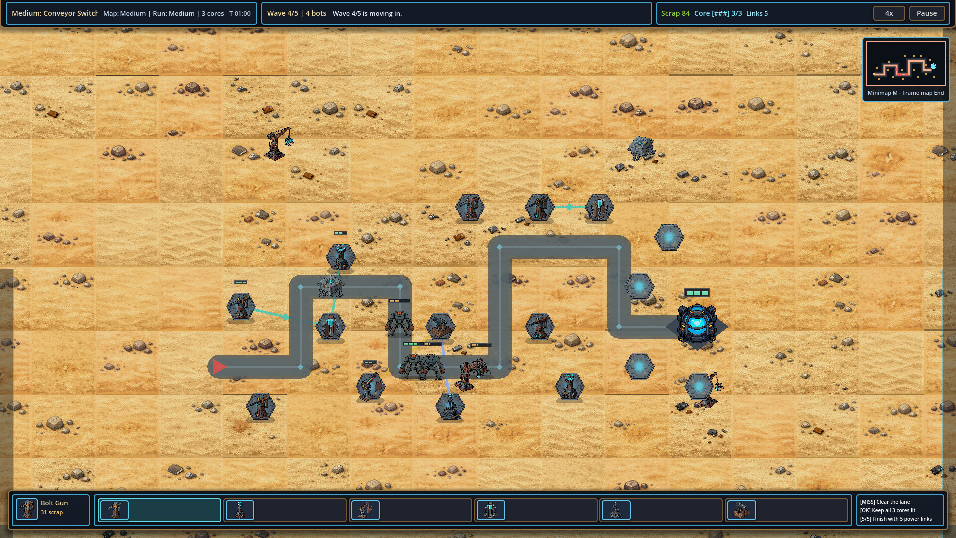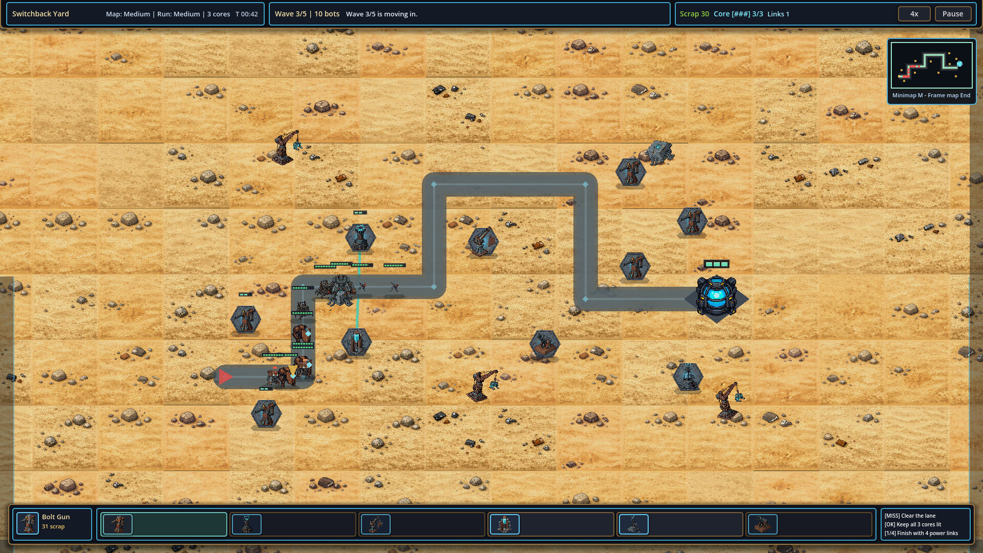 Pick from six tower types, spend scrap on new placements and upgrades, and reshape your defense as each map escalates. The current build supports 23 official maps across Easy, Medium, Hard, and Overclocked difficulty bands, including single-lane, dual-lane, and triple-entry layouts. Normal runs reward clean execution with Bronze / Silver / Gold goals tied to survival, core protection, and map-specific power-link targets.