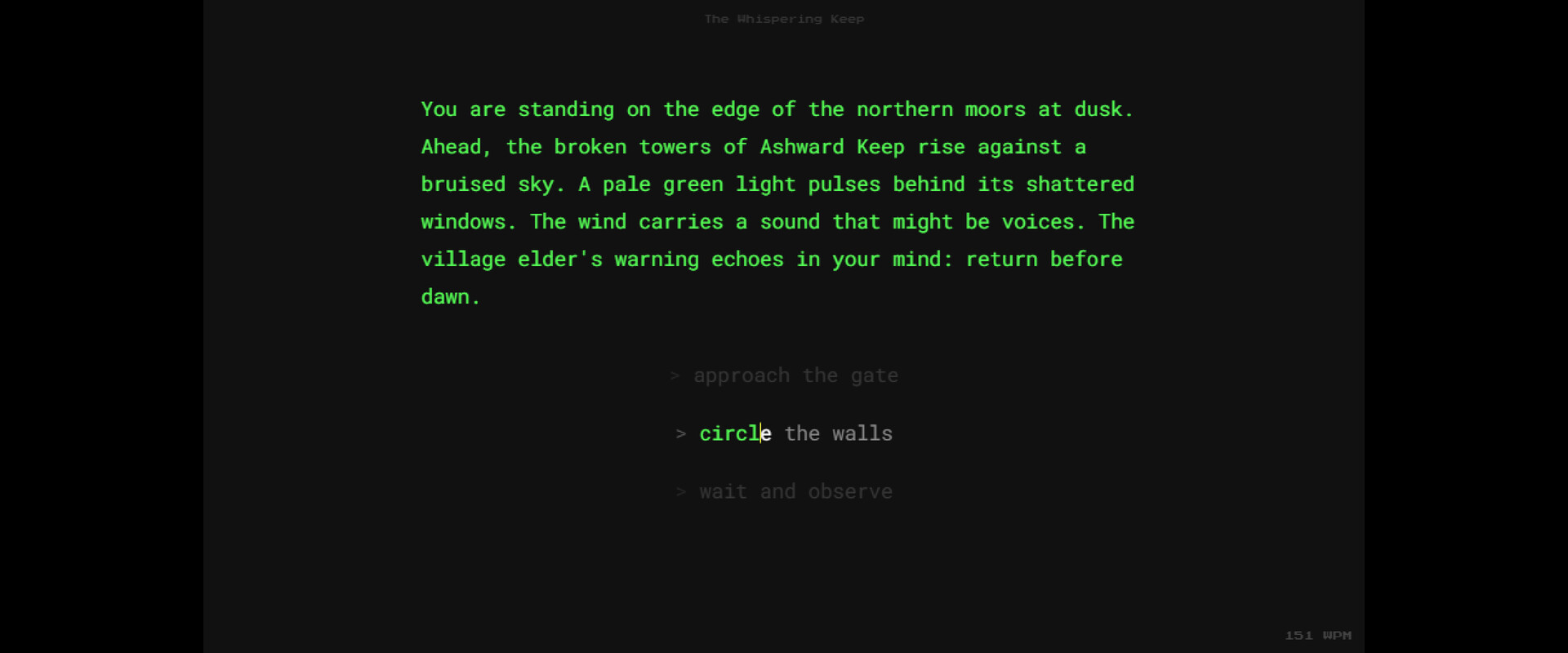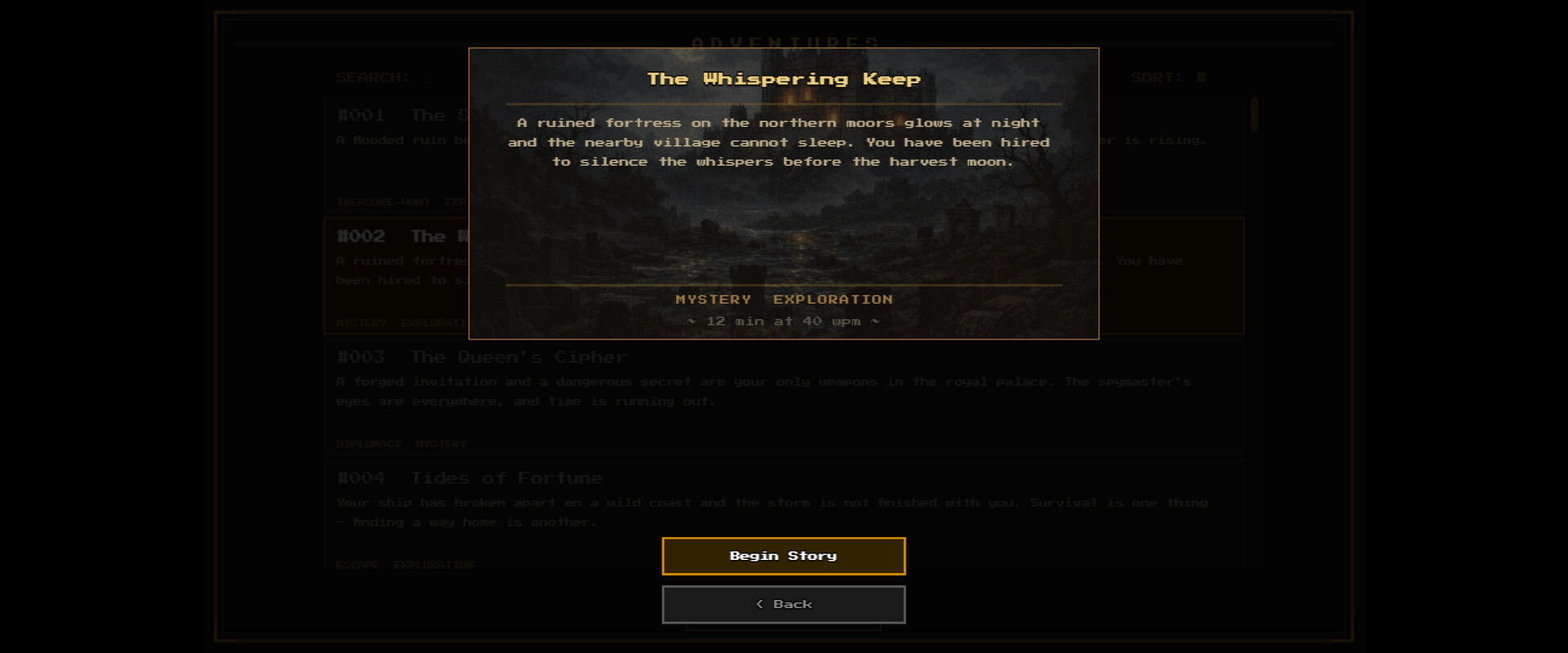 - Adventure Mode — Play through Choose Your Own Adventure stories where you type to progress and your choices shape the narrative.