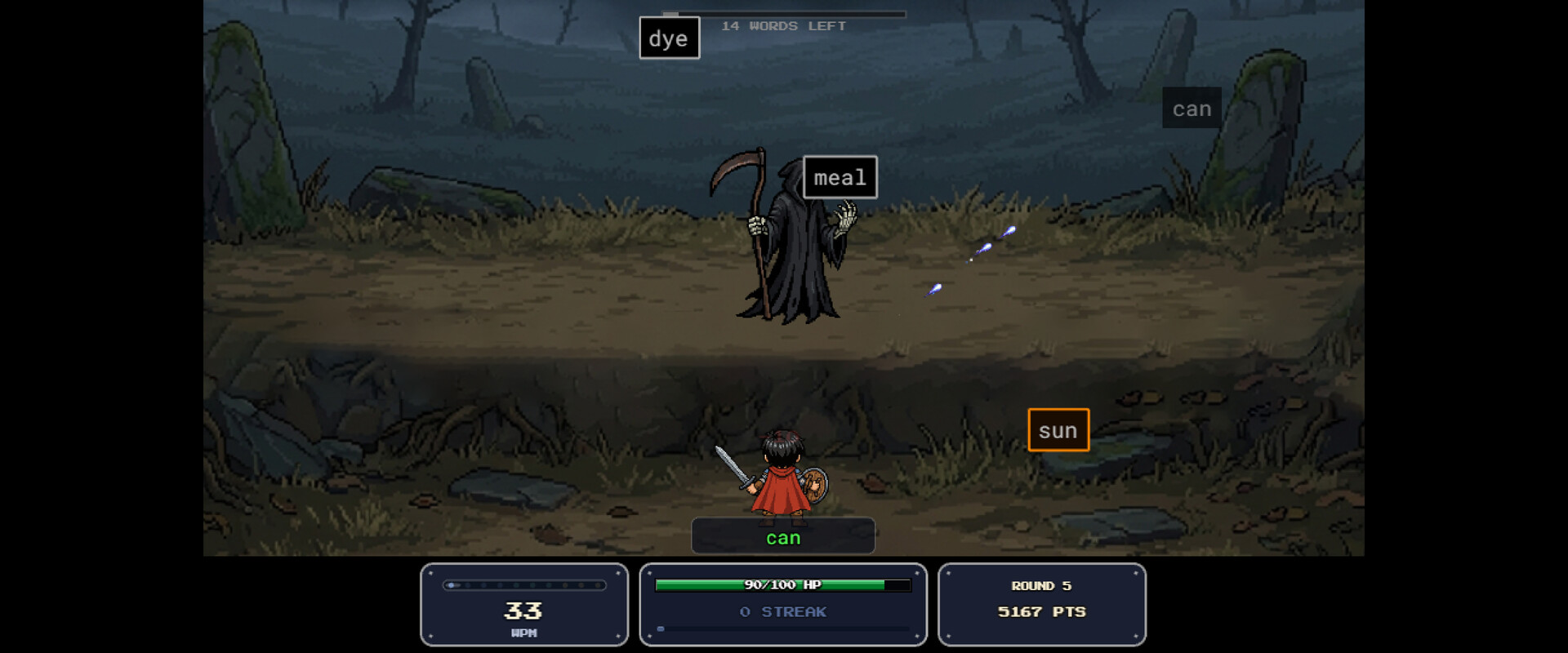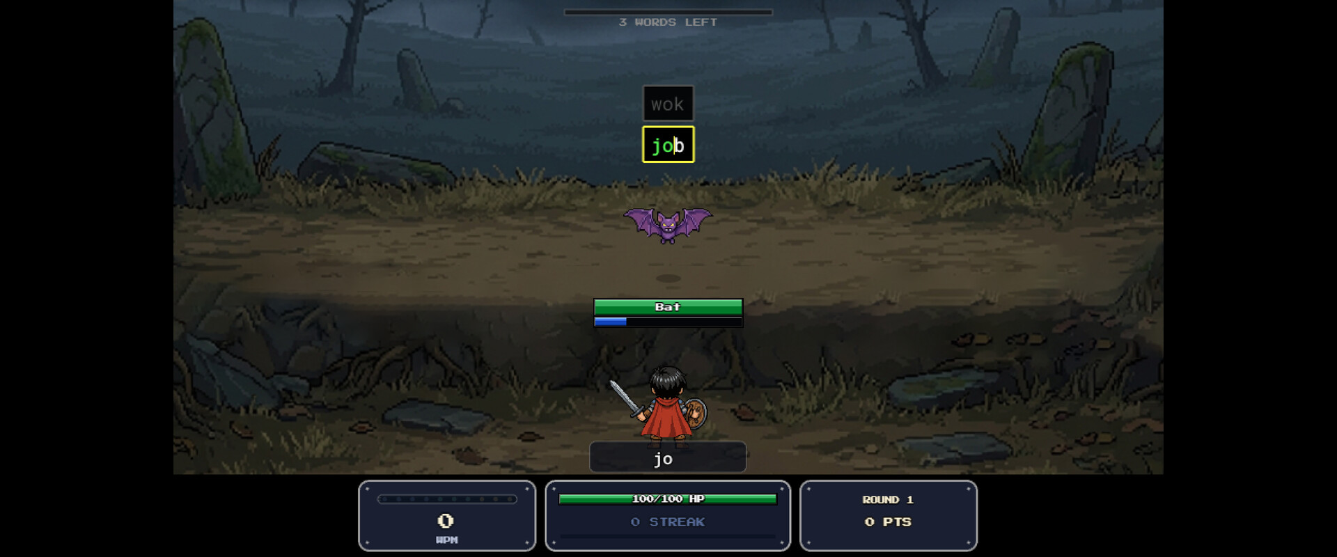 - Classic Mode — Fight through waves of enemies by typing words to attack. Every 5 rounds, face a boss battle.